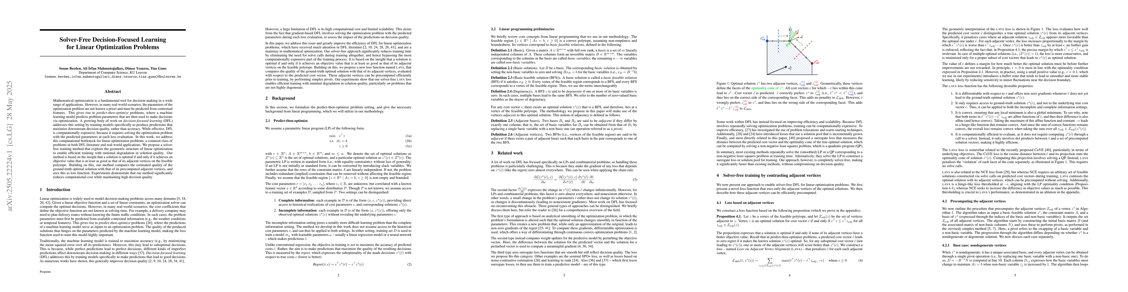 This research proposes a solver-free training method for decision-focused learning in linear optimization problems, reducing computational cost without compromising solution quality.