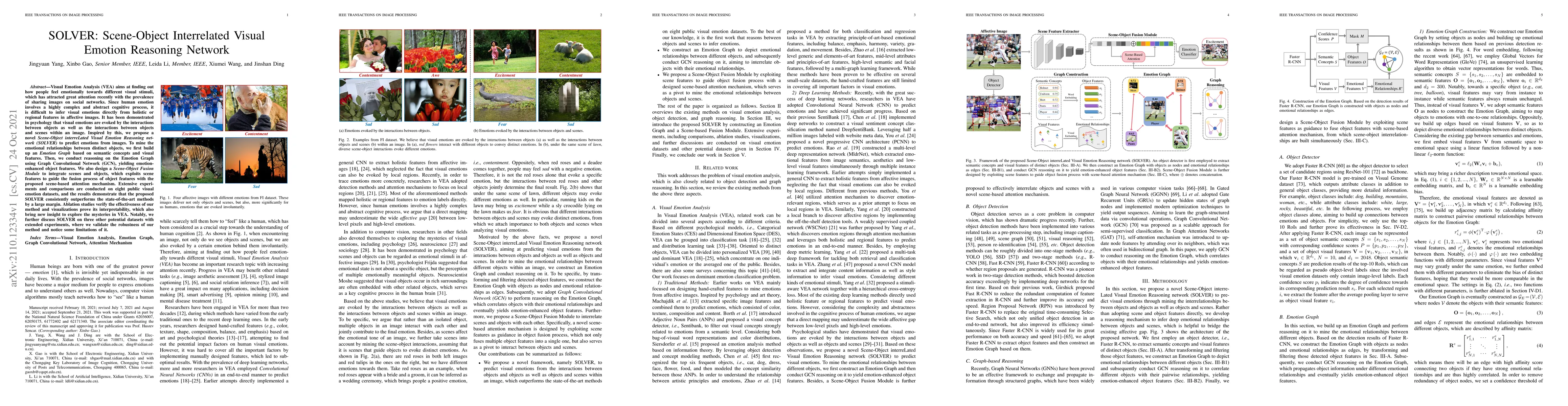 Visual Emotion Analysis (VEA) aims at finding out how people feel emotionally towards different visual stimuli, which has attracted great attention recently with the prevalence of sharing images on social networks. Since human emotion involves a highly complex and abstract cognitive process, it is difficult to infer visual emotions directly from holistic or regional features in affective images. It has been demonstrated in psychology that visual emotions are evoked by the interactions between objects as well as the interactions between objects and scenes within an image. Inspired by this, we propose a novel Scene-Object interreLated Visual Emotion Reasoning network (SOLVER) to predict emotions from images. To mine the emotional relationships between distinct objects, we first build up an Emotion Graph based on semantic concepts and visual features. Then, we conduct reasoning on the Emotion Graph using Graph Convolutional Network (GCN), yielding emotion-enhanced object features. We also design a Scene-Object Fusion Module to integrate scenes and objects, which exploits scene features to guide the fusion process of object features with the proposed scene-based attention mechanism. Extensive experiments and comparisons are conducted on eight public visual emotion datasets, and the results demonstrate that the proposed SOLVER consistently outperforms the state-of-the-art methods by a large margin. Ablation studies verify the effectiveness of our method and visualizations prove its interpretability, which also bring new insight to explore the mysteries in VEA. Notably, we further discuss SOLVER on three other potential datasets with extended experiments, where we validate the robustness of our method and notice some limitations of it.