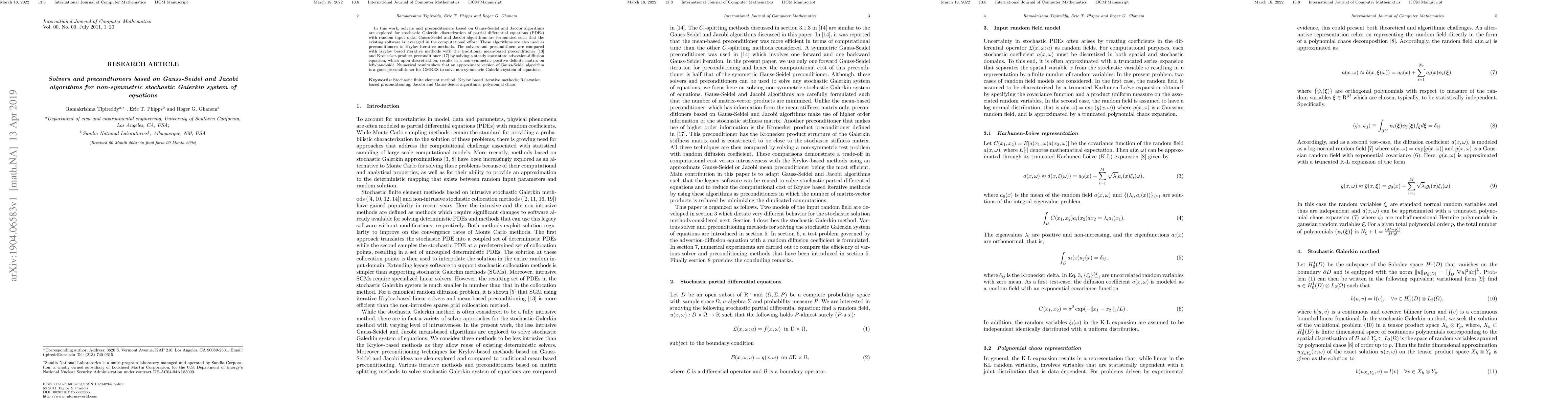 This paper explores Gauss-Seidel and Jacobi solvers and preconditioners for stochastic Galerkin discretization of PDEs with random inputs. Numerical results indicate that an approximate Gauss-Seidel preconditioner effectively improves the performance of GMRES for solving non-symmetric Galerkin systems.