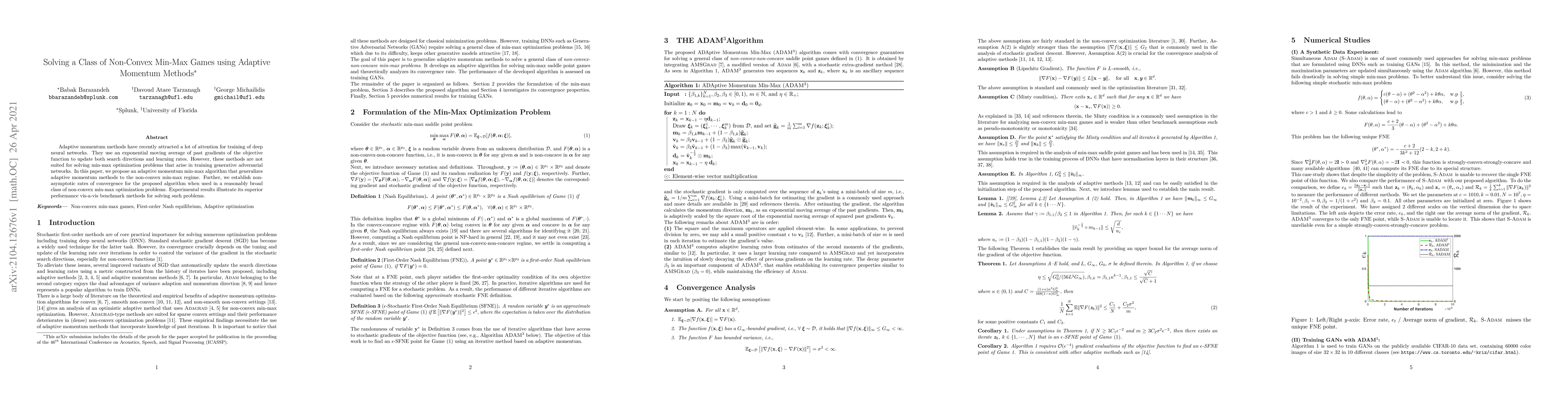 Adaptive momentum methods have recently attracted a lot of attention for training of deep neural networks. They use an exponential moving average of past gradients of the objective function to update both search directions and learning rates. However, these methods are not suited for solving min-max optimization problems that arise in training generative adversarial networks. In this paper, we propose an adaptive momentum min-max algorithm that generalizes adaptive momentum methods to the non-convex min-max regime. Further, we establish non-asymptotic rates of convergence for the proposed algorithm when used in a reasonably broad class of non-convex min-max optimization problems. Experimental results illustrate its superior performance vis-a-vis benchmark methods for solving such problems.
