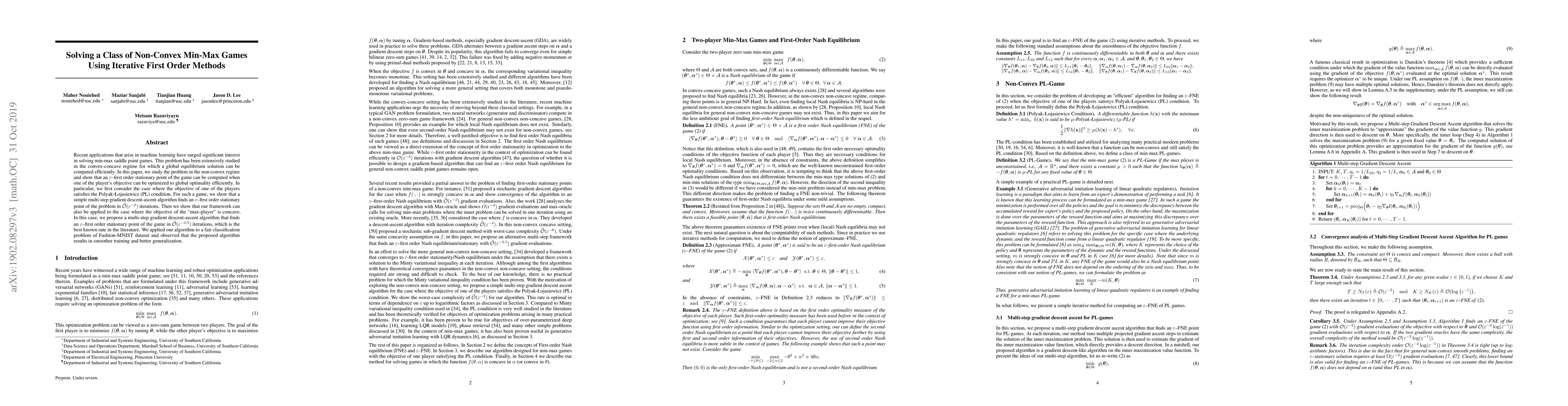 This paper proposes iterative first-order methods to solve non-convex min-max games, achieving ε-first order stationary points. It introduces efficient algorithms for scenarios where one player's objective satisfies the Polyak-{L}ojasiewicz condition and for concave max-player objectives, achieving the best-known convergence rate.