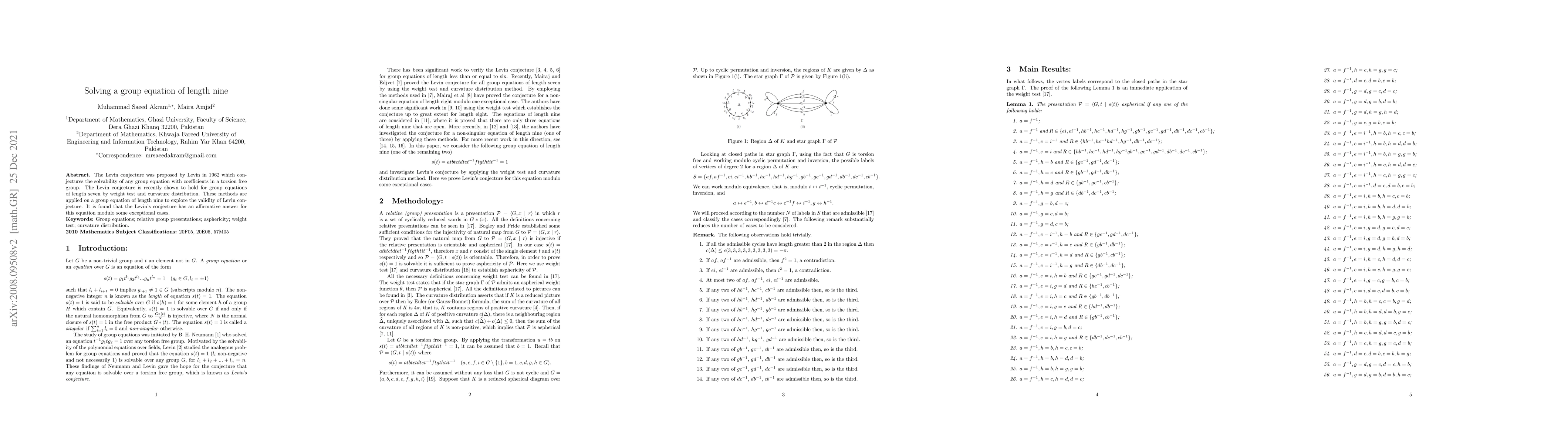 Researchers confirm the Levin conjecture holds for a group equation of length nine, with some exceptional cases, in an affirmative answer that builds on previous findings for equations of length seven.