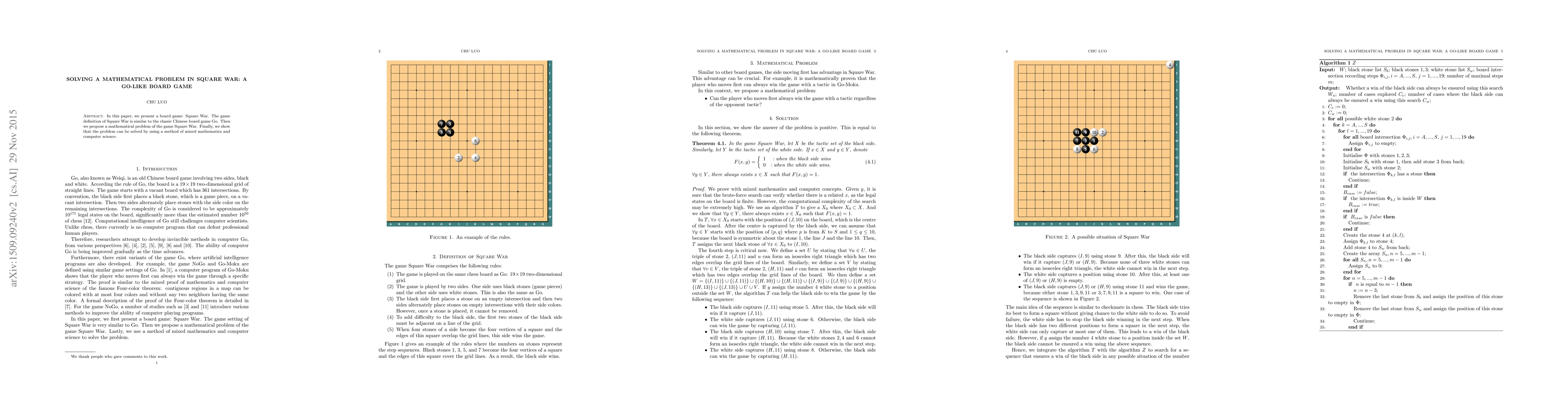 This paper introduces Square War, a Go-like board game, and presents a mathematical problem inherent to it. The authors demonstrate that the problem can be solved through a combination of mathematical and computer science techniques.