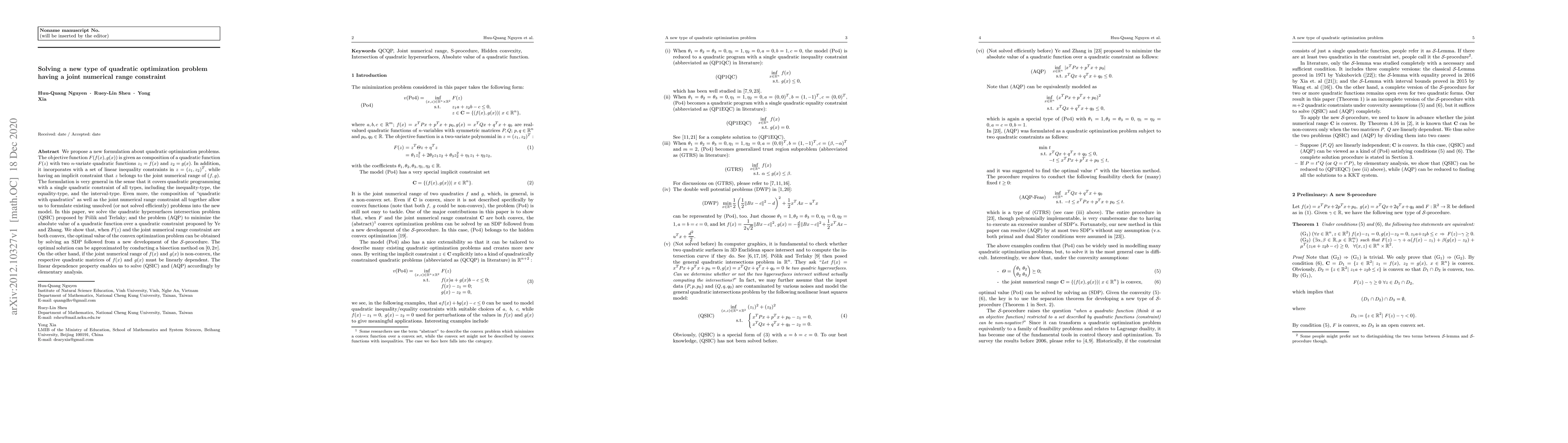 This paper proposes a new formulation for quadratic optimization problems involving a joint numerical range constraint, solving previously unsolved problems like the quadratic hypersurfaces intersection problem (QSIC) and the problem to minimize the absolute value of a quadratic function over a quadratic constraint (AQP). When the objective function and the constraint are convex, the optimal solution is obtained via an SDP and bisection method; for non-convex cases, linear dependence of the quadratic matrices is utilized for elementary analysis.