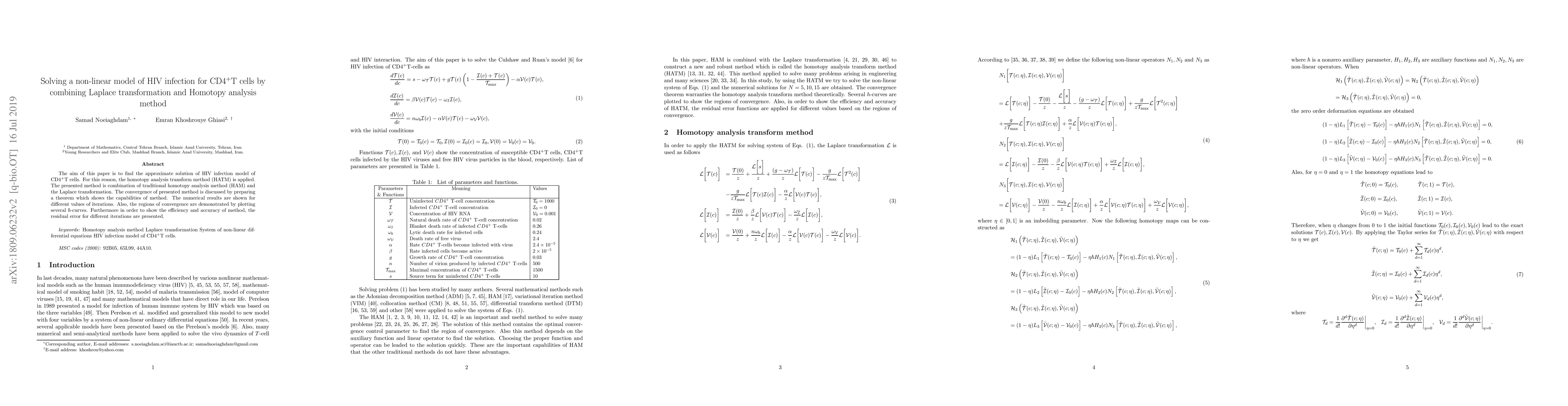 The aim of this paper is to find the approximate solution of HIV infection model of CD4+T cells. For this reason, the homotopy analysis transform method (HATM) is applied. The presented method is combination of traditional homotopy analysis method (HAM) and the Laplace transformation. The convergence of presented method is discussed by preparing a theorem which shows the capabilities of method. The numerical results are shown for different values of iterations. Also, the regions of convergence are demonstrated by plotting several h-curves. Furthermore in order to show the efficiency and accuracy of method, the residual error for different iterations are presented.