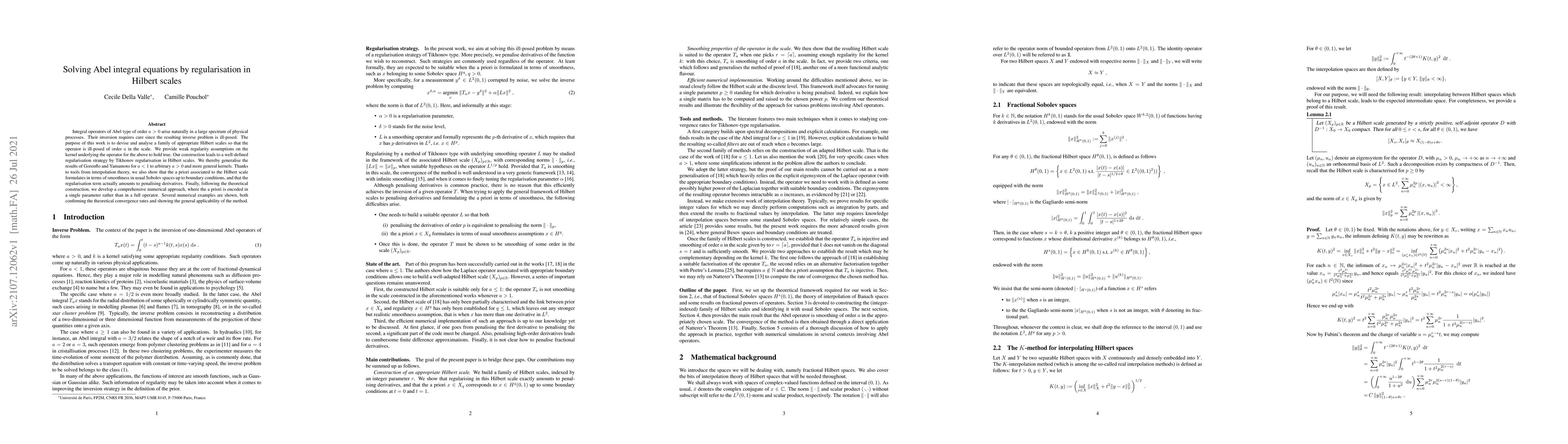 Integral operators of Abel type of order a > 0 arise naturally in a large spectrum of physical processes. Their inversion requires care since the resulting inverse problem is ill-posed. The purpose of this work is to devise and analyse a family of appropriate Hilbert scales so that the operator is ill-posed of order a in the scale. We provide weak regularity assumptions on the kernel underlying the operator for the above to hold true. Our construction leads to a well-defined regularisation strategy by Tikhonov regularisation in Hilbert scales. We thereby generalise the results of Gorenflo and Yamamoto for a < 1 to arbitrary a > 0 and more general kernels. Thanks to tools from interpolation theory, we also show that the a priori associated to the Hilbert scale formulates in terms of smoothness in usual Sobolev spaces up to boundary conditions, and that the regularisation term actually amounts to penalising derivatives. Finally, following the theoretical construction, we develop a comprehensive numerical approach, where the a priori is encoded in a single parameter rather than in a full operator. Several numerical examples are shown, both confirming the theoretical convergence rates and showing the general applicability of the method.