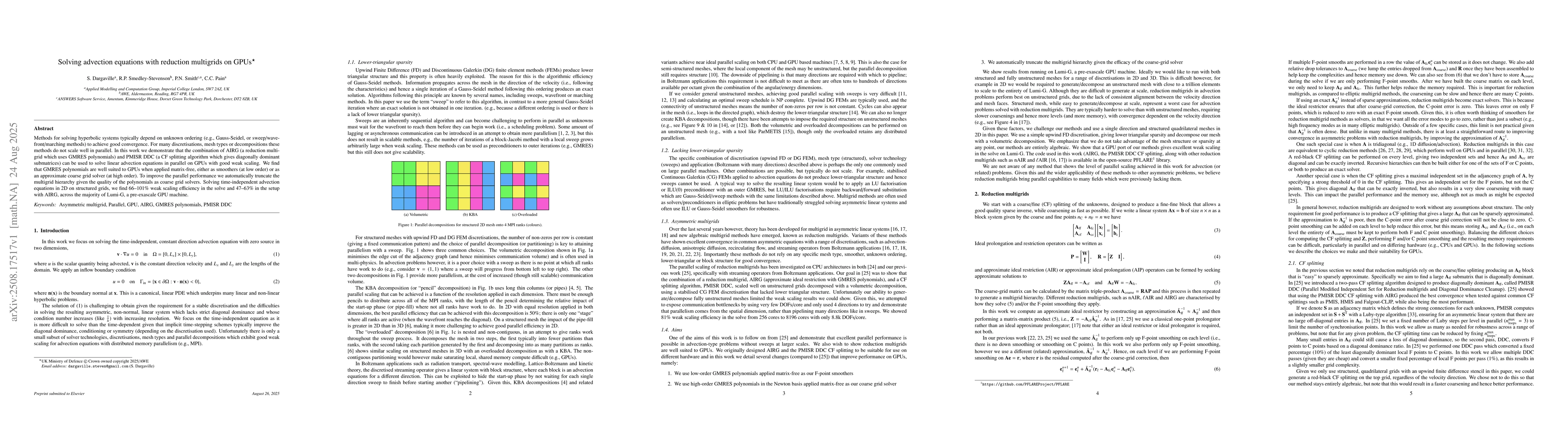 Methods for solving hyperbolic systems typically depend on unknown ordering (e.g., Gauss-Seidel, or sweep/wavefront/marching methods) to achieve good convergence. For many discretisations, mesh types or decompositions these methods do not scale well in parallel. In this work we demonstrate that the combination of AIRG (a reduction multigrid which uses GMRES polynomials) and PMISR DDC (a CF splitting algorithm which gives diagonally dominant submatrices) can be used to solve linear advection equations in parallel on GPUs with good weak scaling. We find that GMRES polynomials are well suited to GPUs when applied matrix-free, either as smoothers (at low order) or as an approximate coarse grid solver (at high order). To improve the parallel performance we automatically truncate the multigrid hierarchy given the quality of the polynomials as coarse grid solvers. Solving time-independent advection equations in 2D on structured grids, we find 66-101% weak scaling efficiency in the solve and 47-63% in the setup with AIRG, across the majority of Lumi-G, a pre-exascale GPU machine.