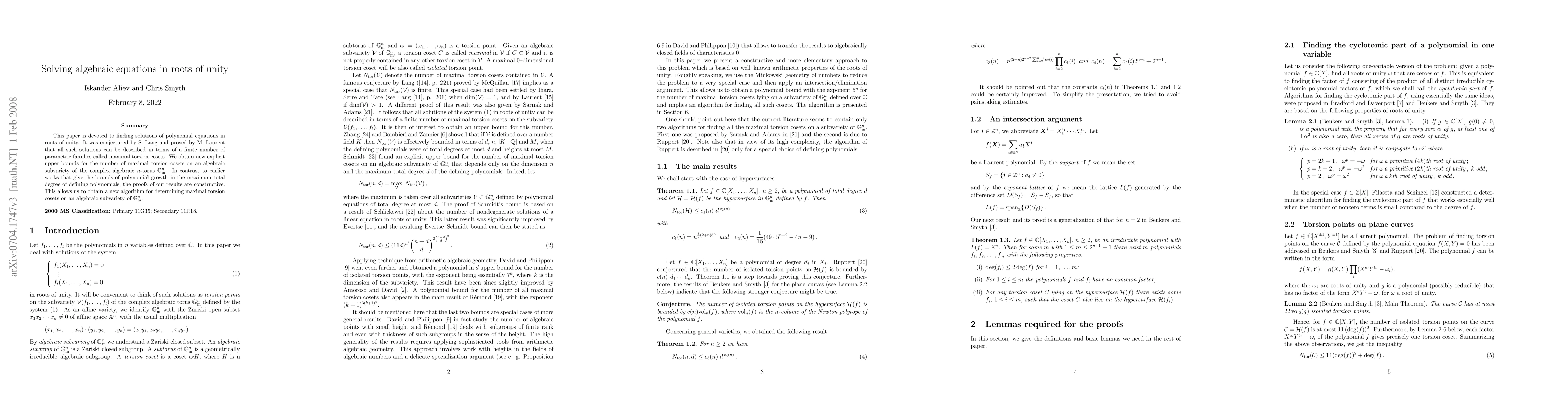 This paper is devoted to finding solutions of polynomial equations in roots of unity. It was conjectured by S. Lang and proved by M. Laurent that all such solutions can be described in terms of a finite number of parametric families called maximal torsion cosets. We obtain new explicit upper bounds for the number of maximal torsion cosets on an algebraic subvariety of the complex algebraic $n$-torus ${\mathbb G}_{\rm m}^n$. In contrast to earlier works that give the bounds of polynomial growth in the maximum total degree of defining polynomials, the proofs of our results are constructive. This allows us to obtain a new algorithm for determining maximal torsion cosets on an algebraic subvariety of ${\mathbb G}_{\rm m}^n$.