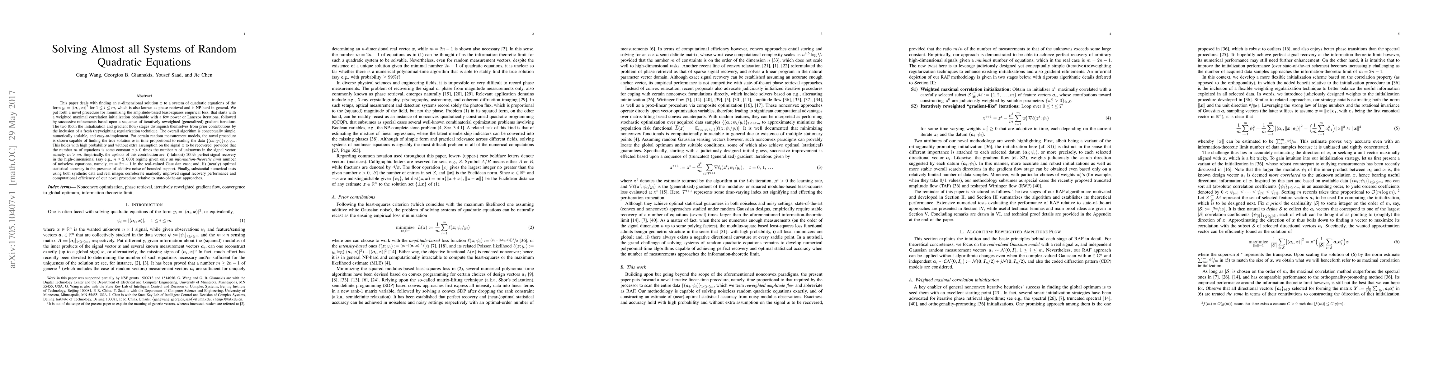 Researchers develop a novel algorithm for solving systems of random quadratic equations, achieving perfect signal recovery in high-dimensional cases with only a limited number of noiseless equations, and demonstrating improved computational efficiency over existing approaches.