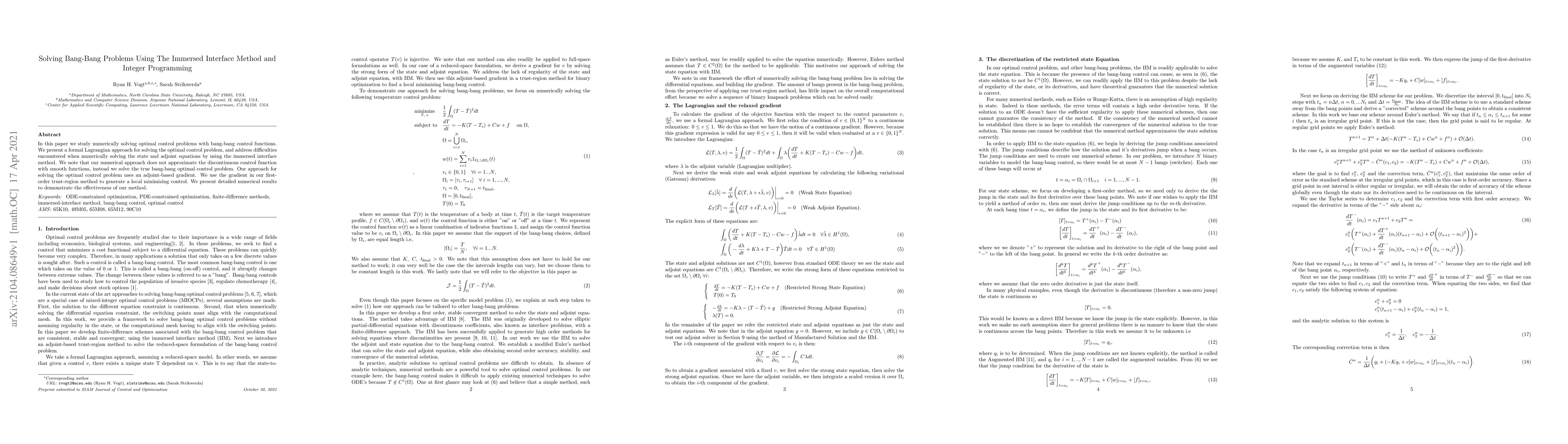 This paper proposes a method combining the Immersed Interface Method and integer programming to solve optimal control problems with bang-bang control functions, directly addressing the discontinuous nature of the control without approximation, and demonstrating its effectiveness through numerical results.