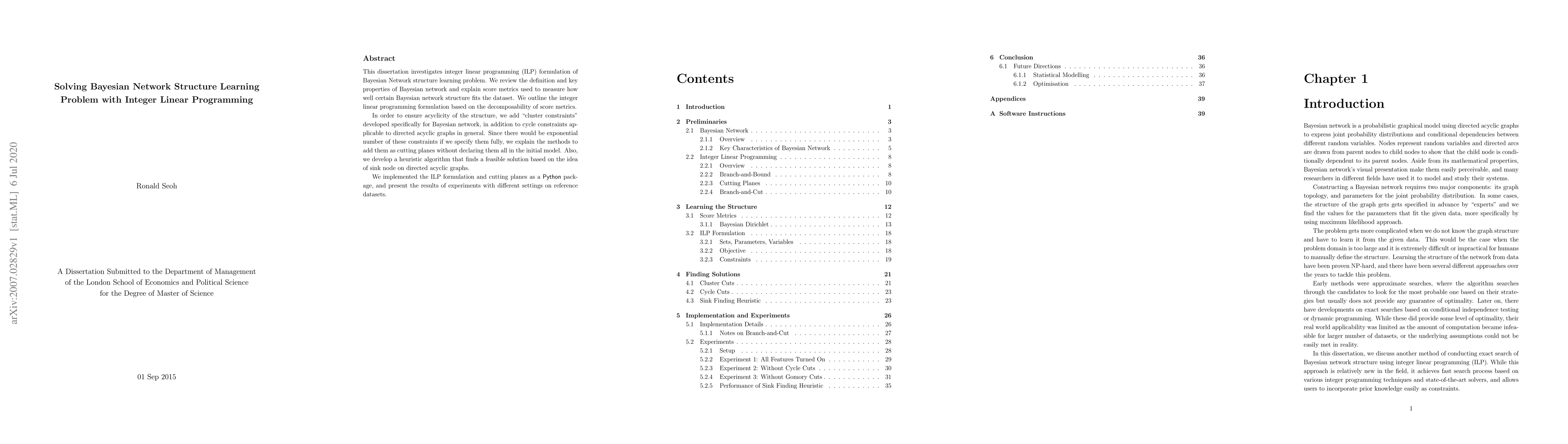 This paper proposes an integer linear programming (ILP) approach for Bayesian Network structure learning, incorporating specific cluster constraints to maintain acyclicity. The authors implement their method in Python and demonstrate its effectiveness through experiments on reference datasets.