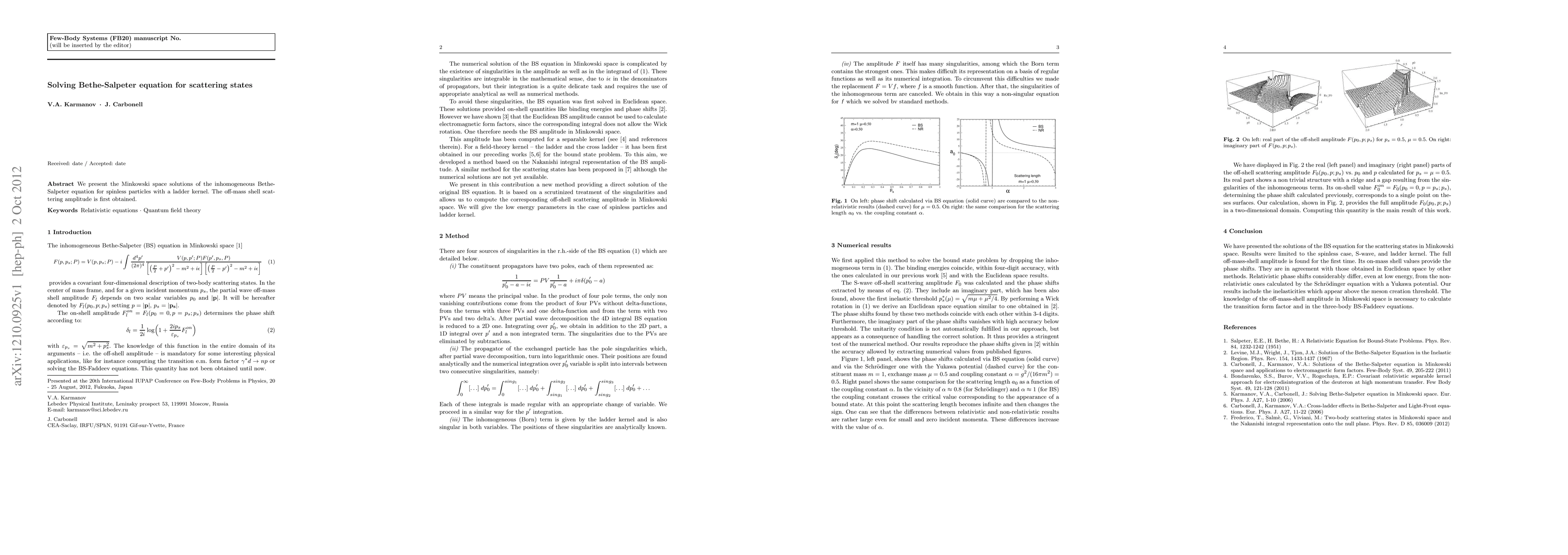 Summary: This paper presents Minkowski space solutions to the inhomogeneous Bethe-Salpeter equation for spinless particles using a ladder kernel, leading to the derivation of an off-mass shell scattering amplitude.
