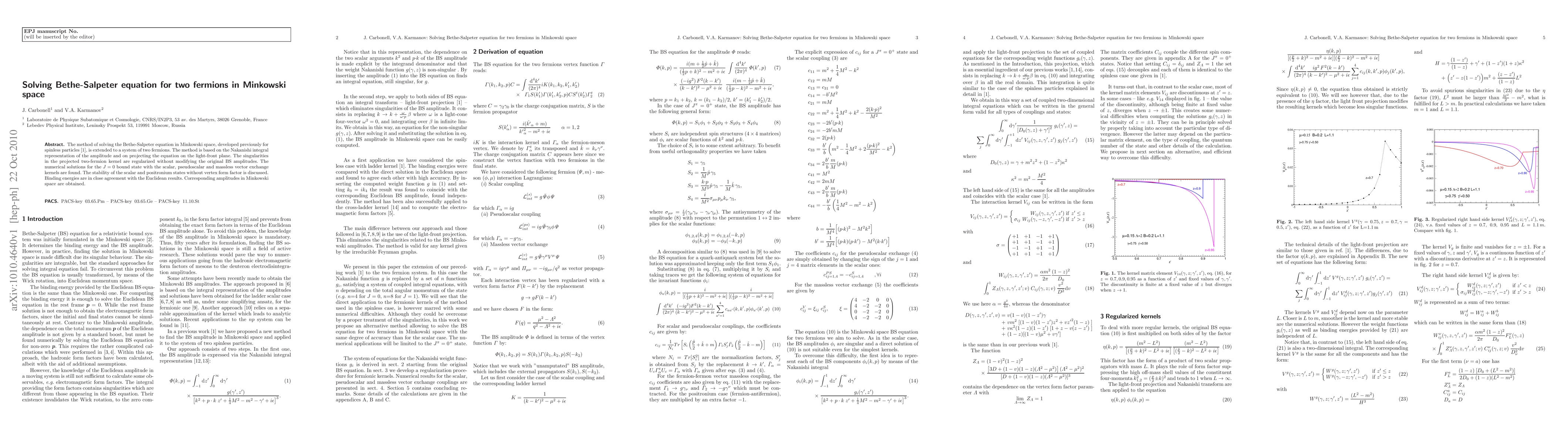 This paper extends a previously developed method for solving the Bethe-Salpeter equation to a system of two fermions in Minkowski space, using the Nakanishi integral representation and light-front projection. The study finds numerical solutions for J=0 bound states and discusses the stability of scalar and positronium states, achieving binding energies consistent with Euclidean results.