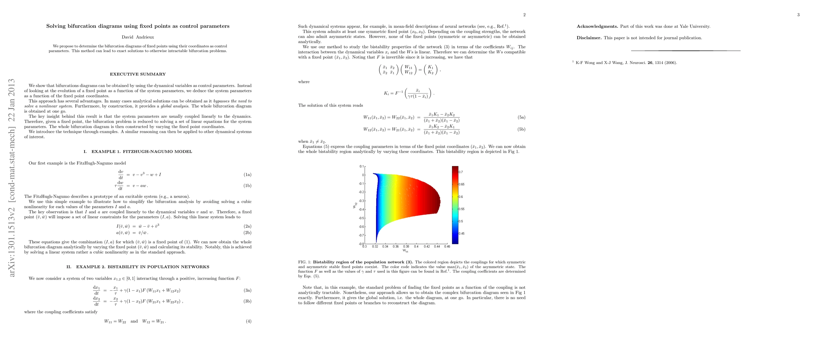 Summary: This paper introduces a novel method to solve bifurcation diagrams by utilizing the coordinates of fixed points as control parameters, offering an exact solution approach to complex bifurcation problems. The technique provides a new perspective on analyzing and understanding bifurcation phenomena.
