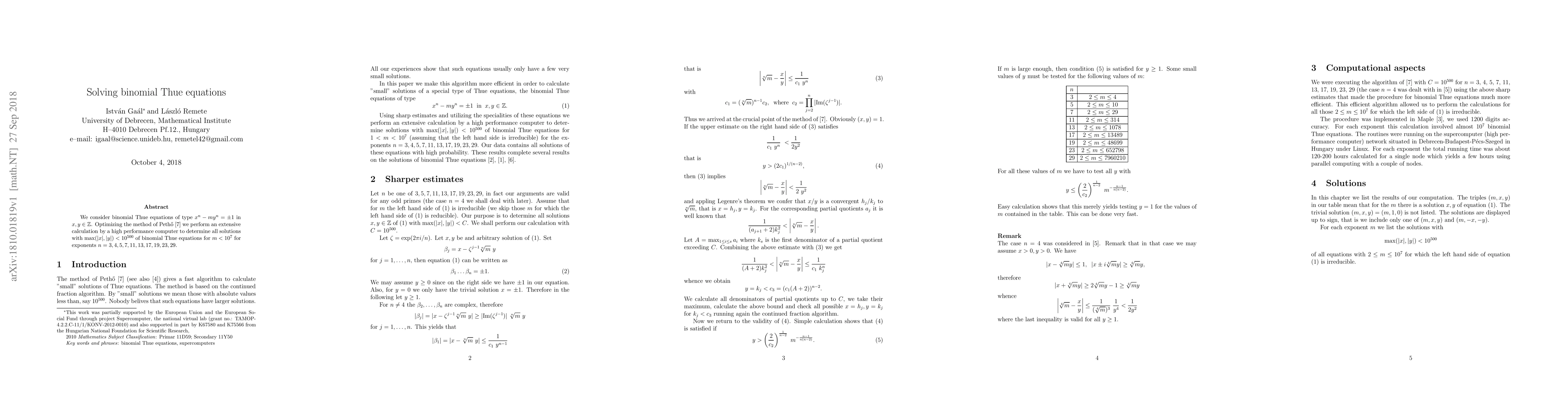 Researchers solved a complex math problem known as binomial Thue equations for specific exponents and limits, finding solutions to equations like x^n - my^n = ±1 for large values of n and m.