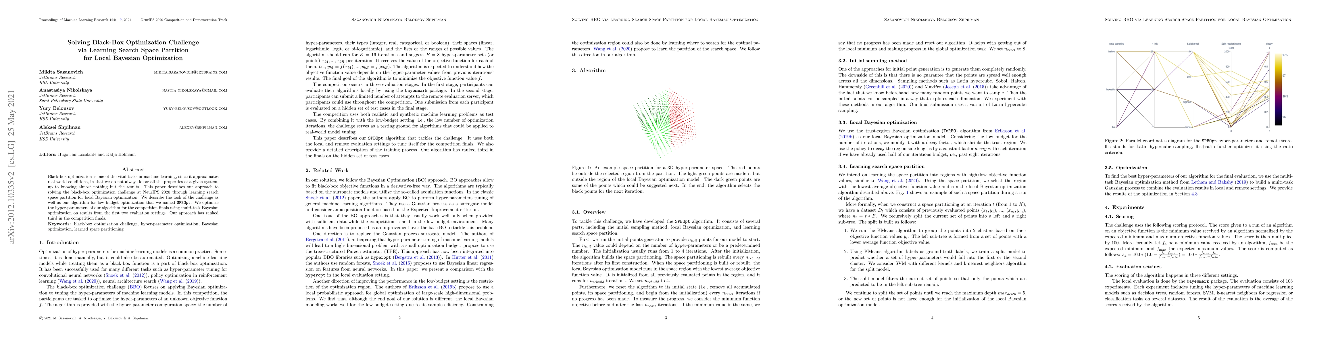 This paper presents an approach to tackle black-box optimization challenges by learning the search space partition for local Bayesian optimization, named \texttt{SPBOpt}. The method ranked third in the NeurIPS 2020 competition, optimizing hyperparameters via multi-task Bayesian optimization.
