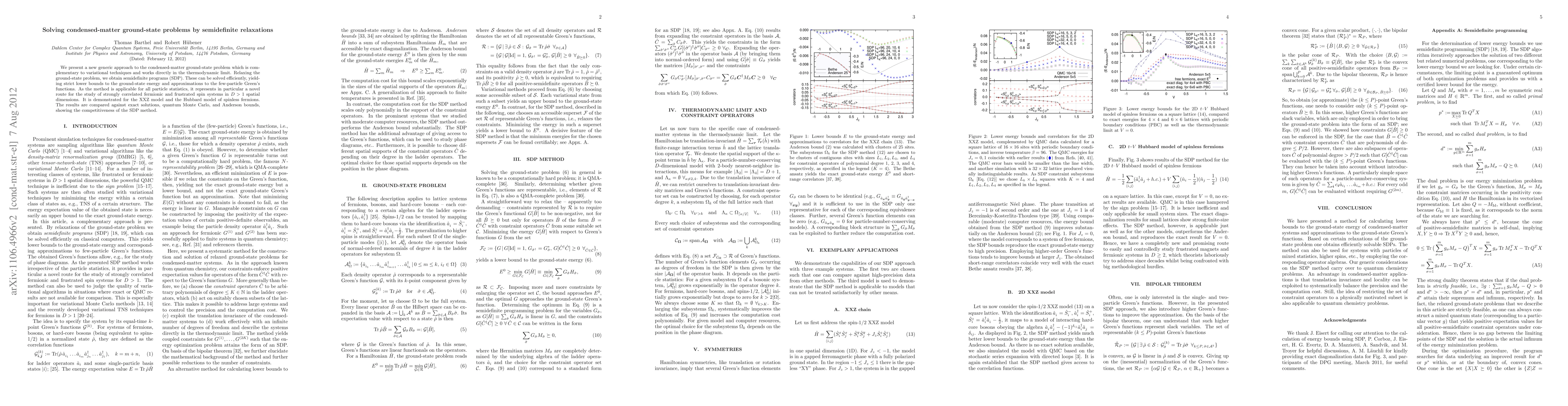 We present a new generic approach to the condensed-matter ground-state problem which is complementary to variational techniques and works directly in the thermodynamic limit. Relaxing the ground-state problem, we obtain semidefinite programs (SDP). These can be solved efficiently, yielding strict lower bounds to the ground-state energy and approximations to the few-particle Green's functions. As the method is applicable for all particle statistics, it represents in particular a novel route for the study of strongly correlated fermionic and frustrated spin systems in D>1 spatial dimensions. It is demonstrated for the XXZ model and the Hubbard model of spinless fermions. The results are compared against exact solutions, quantum Monte Carlo, and Anderson bounds, showing the competitiveness of the SDP method.