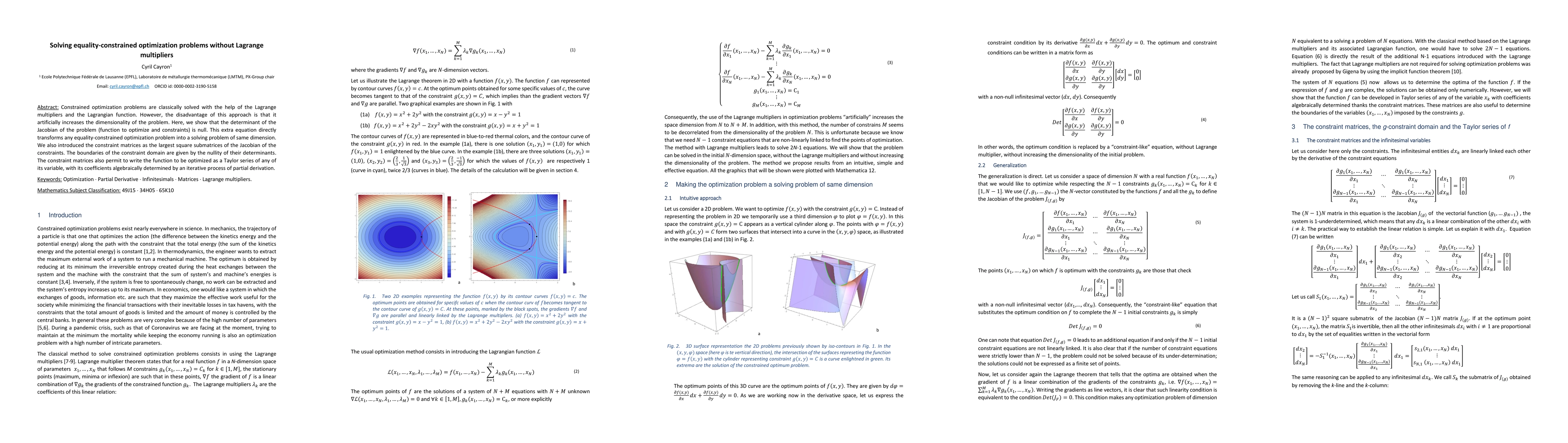 Constrained optimization problems exist in many domains of science, such as thermodynamics, mechanics, economics, etc. These problems are classically solved with the help of the Lagrange multipliers and the Lagrangian function. However, the disadvantage of this approach is that it artificially increases the dimensionality of the problem. Here, we show that the determinant of the Jacobian of the problem (function to optimize and constraints) is null. This extra equation transforms any equality-constrained optimization problem into a solving problem of same dimension. We also introduced the constraint matrices as the largest square submatrices of the Jacobian of the constraints. The boundaries of the constraint domain are given by the nullity of their determinants. The constraint matrices also permit to write the function to be optimized as a Taylor series of any of its variable, with its coefficients algebraically determined by an iterative process of partial derivation.