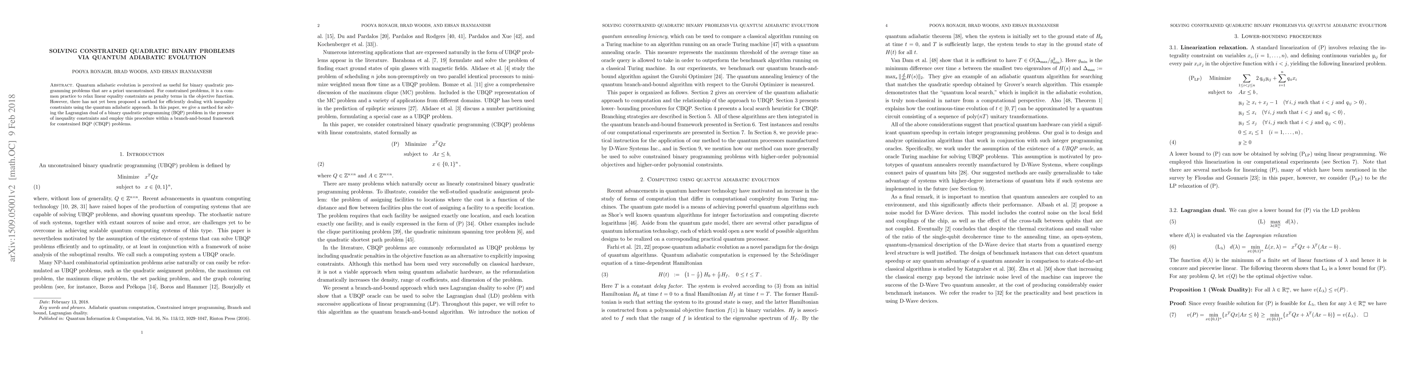 This paper proposes a method for solving constrained binary quadratic programming (CBQP) problems using quantum adiabatic evolution by incorporating inequality constraints into the Lagrangian dual. It employs this approach within a branch-and-bound framework to efficiently handle such problems.