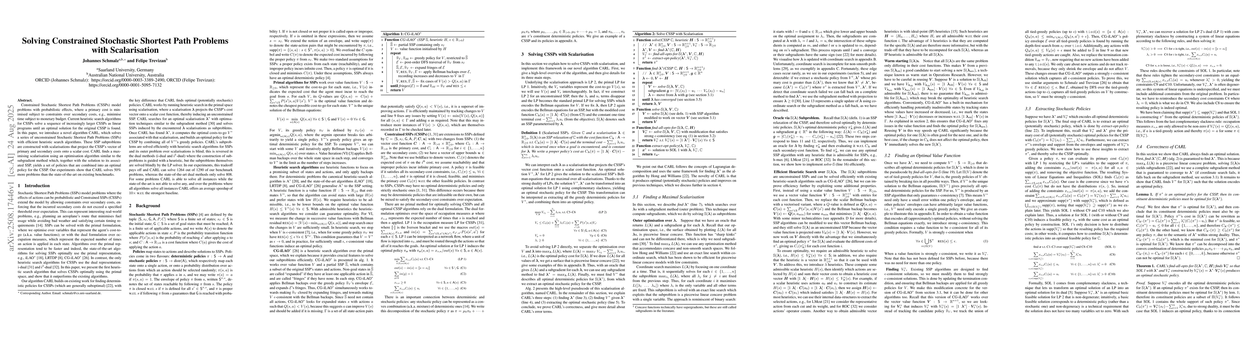 Constrained Stochastic Shortest Path Problems (CSSPs) model problems with probabilistic effects, where a primary cost is minimised subject to constraints over secondary costs, e.g., minimise time subject to monetary budget. Current heuristic search algorithms for CSSPs solve a sequence of increasingly larger CSSPs as linear programs until an optimal solution for the original CSSP is found. In this paper, we introduce a novel algorithm CARL, which solves a series of unconstrained Stochastic Shortest Path Problems (SSPs) with efficient heuristic search algorithms. These SSP subproblems are constructed with scalarisations that project the CSSP's vector of primary and secondary costs onto a scalar cost. CARL finds a maximising scalarisation using an optimisation algorithm similar to the subgradient method which, together with the solution to its associated SSP, yields a set of policies that are combined into an optimal policy for the CSSP. Our experiments show that CARL solves 50% more problems than the state-of-the-art on existing benchmarks.