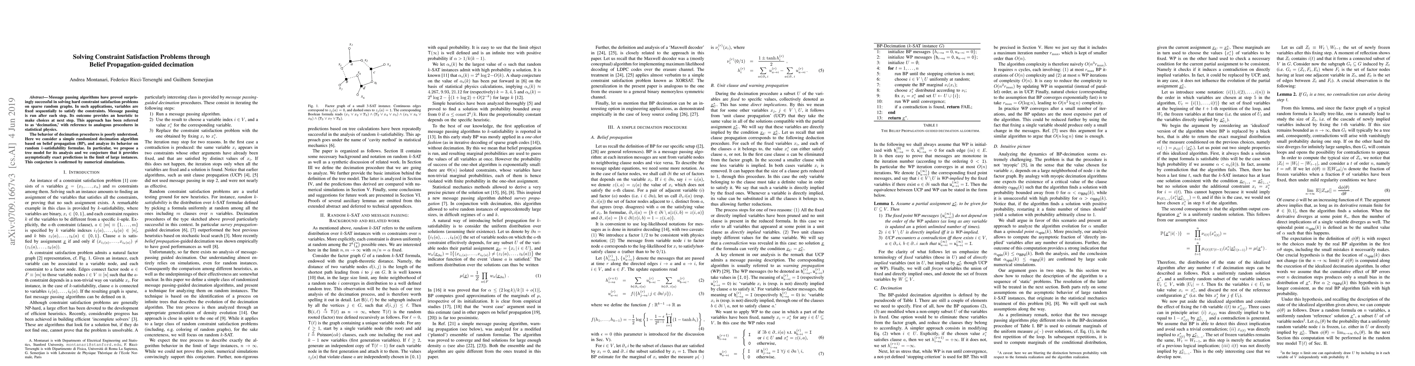 The paper proposes a simple randomized decimation algorithm based on belief propagation (BP) for solving constraint satisfaction problems (CSPs), particularly k-satisfiability (k-SAT). The behavior of this decimation procedure is analyzed using a tree model, which is conjectured to provide asymptotically exact predictions in the limit of large instances, confirmed by numerical simulations.