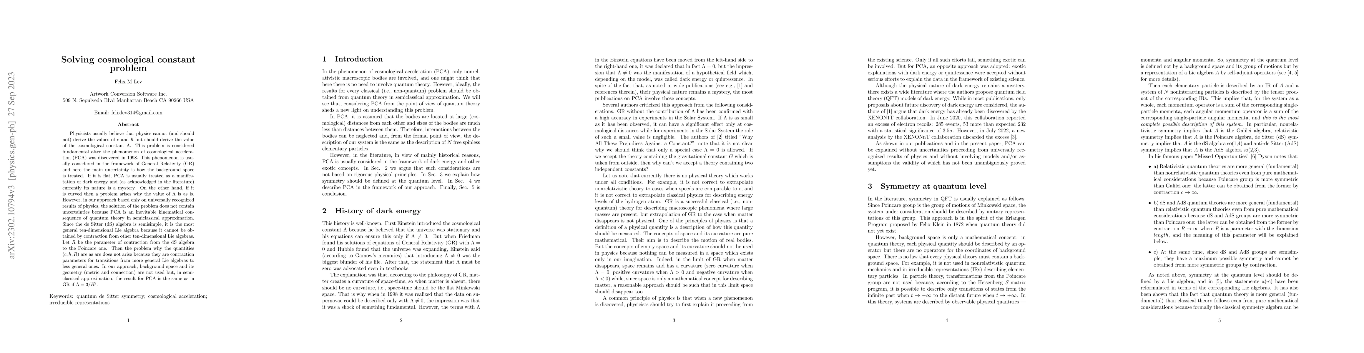 This paper proposes a solution to the cosmological constant problem by demonstrating that the observed cosmological acceleration (PCA) is a natural consequence of quantum theory in semiclassical approximation. The authors argue that PCA arises from the contraction of the de Sitter algebra to the Poincaré algebra, eliminating uncertainties about the cosmological constant's value.