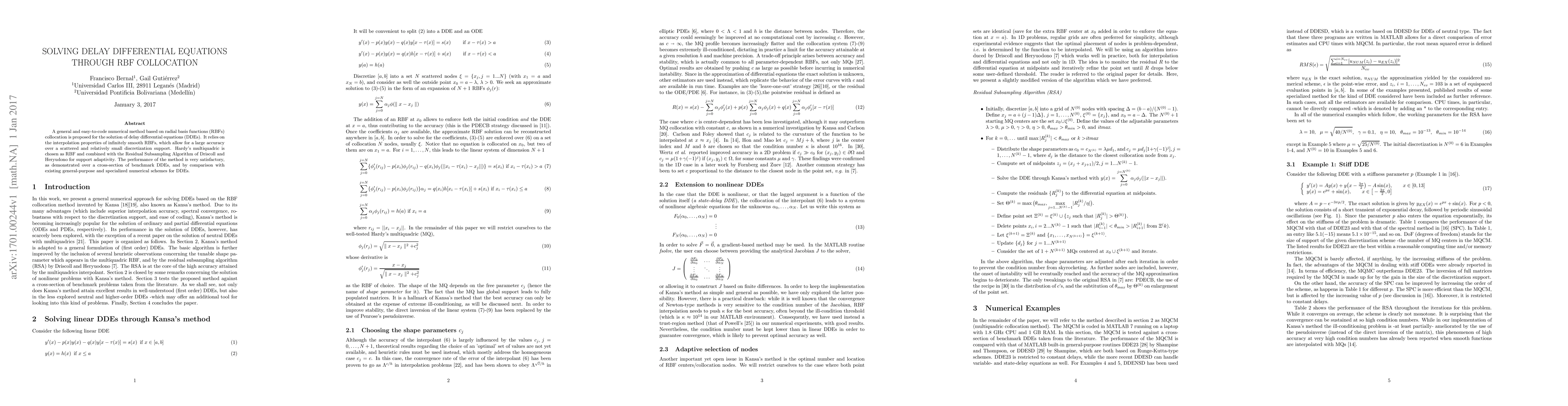 This paper proposes a numerical method using radial basis function (RBF) collocation for solving delay differential equations (DDEs), leveraging Hardy's multiquadric RBF and the Residual Subsampling Algorithm for high accuracy and adaptivity. The method's effectiveness is demonstrated through benchmark DDEs and comparisons with existing numerical schemes.