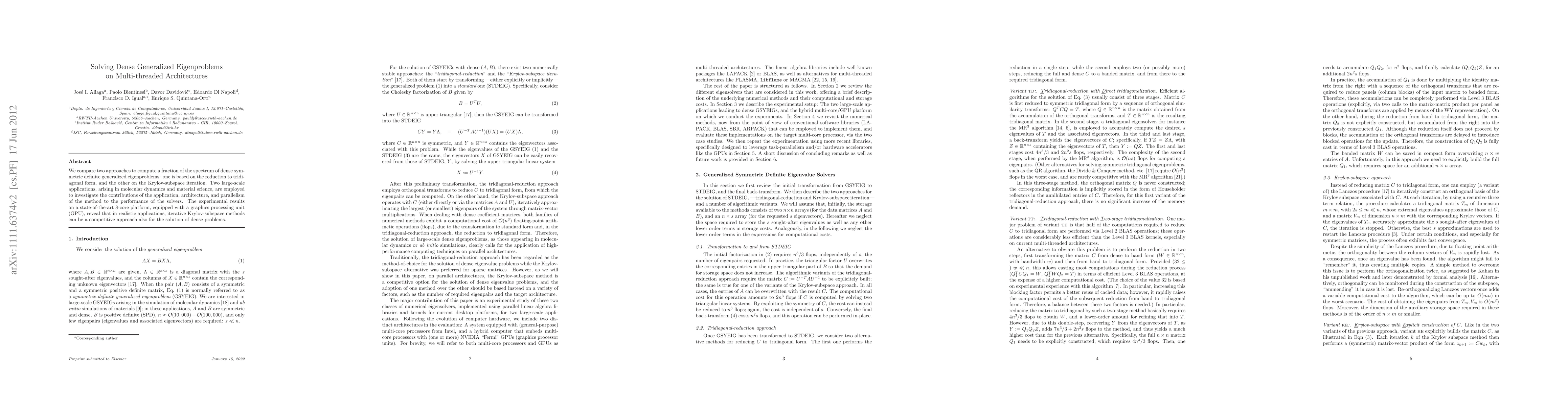 This paper compares the performance of two methods for solving dense symmetric generalized eigenproblems on multi-threaded architectures, finding that iterative Krylov-subspace methods are competitive even for dense problems, as demonstrated through applications in molecular dynamics and material science. Experimental results on an 8-core platform with a GPU highlight the benefits of parallelism in these methods.