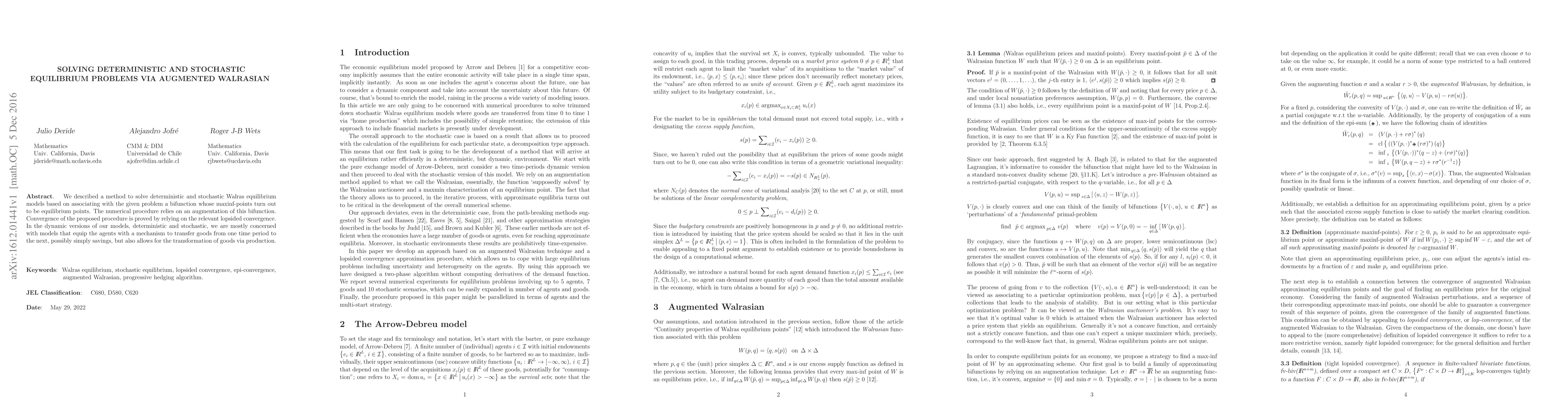 We described a method to solve deterministic and stochastic Walras equilibrium models based on associating with the given problem a bifunction whose maxinf-points turn out to be equilibrium points. The numerical procedure relies on an augmentation of this bifunction. Convergence of the proposed procedure is proved by relying on the relevant lopsided convergence. In the dynamic versions of our models, deterministic and stochastic, we are mostly concerned with models that equip the agents with a mechanism to transfer goods from one time period to the next, possibly simply savings, but also allows for the transformation of goods via production