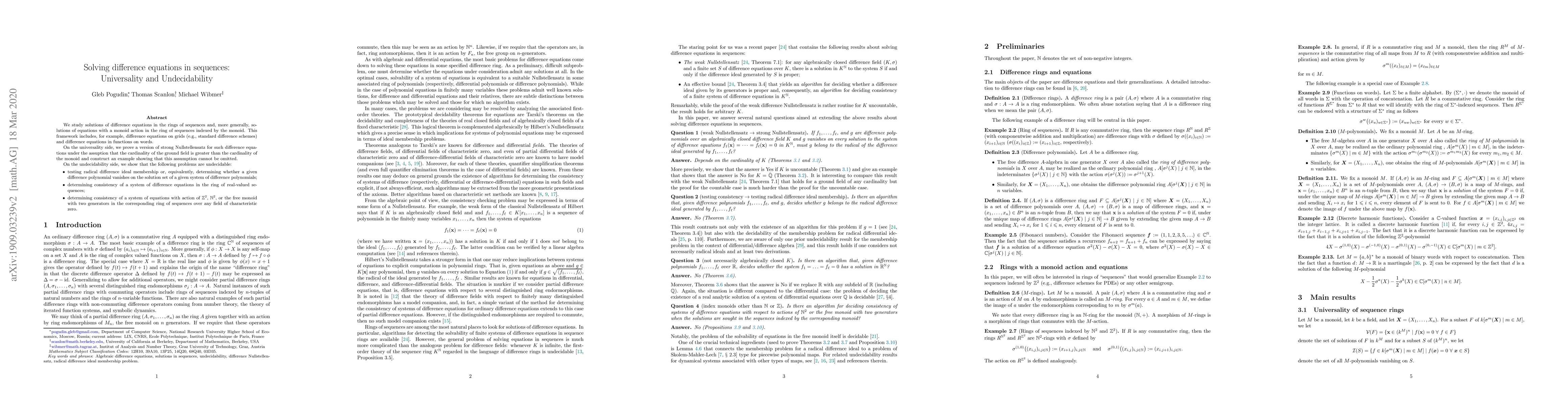 $ $We study solutions of difference equations in the rings of sequences and, more generally, solutions of equations with a monoid action in the ring of sequences indexed by the monoid. This framework includes, for example, difference equations on grids (e.g., standard difference schemes) and difference equations in functions on words. On the universality side, we prove a version of strong Nullstellensatz for such difference equations under the assuption that the cardinality of the ground field is greater than the cardinality of the monoid and construct an example showing that this assumption cannot be omitted. On the undecidability side, we show that the following problems are undecidable: $\bullet$ testing radical difference ideal membership or, equivalently, determining whether a given difference polynomial vanishes on the solution set of a given system of difference polynomials; $\bullet$ determining consistency of a system of difference equations in the ring of real-valued sequences; $\bullet$ determining consistency of a system of equations with action of $\mathbb{Z}^2$, $\mathbb{N}^2$, or the free monoid with two generators in the corresponding ring of sequences over any field of characteristic zero.