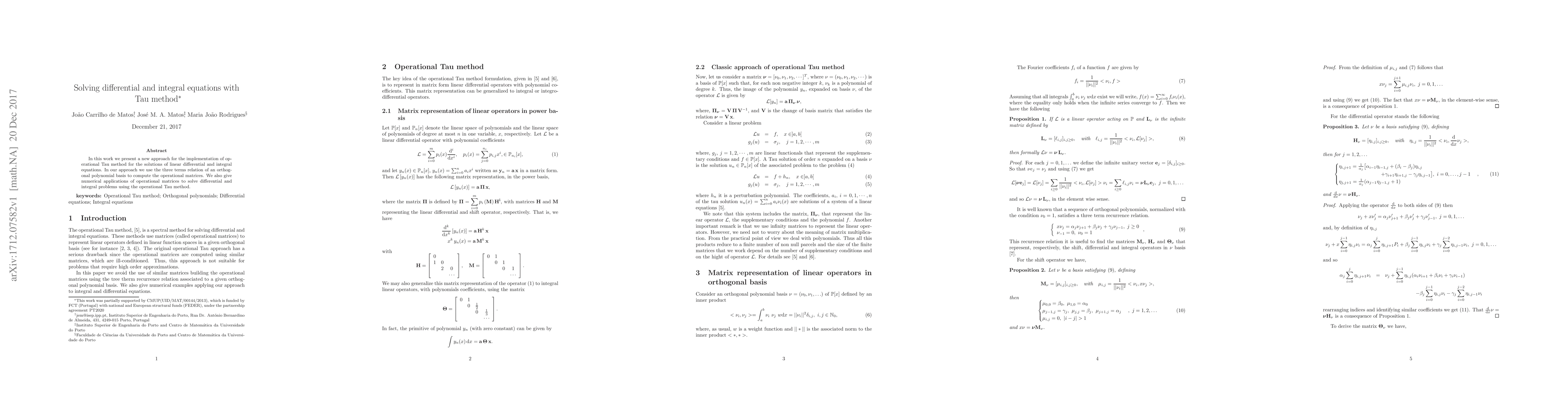 In this work we present a new approach for the implementation of operational Tau method for the solutions of linear differential and integral equations. In our approach we use the three terms relation of an orthogonal polynomial basis to compute the operational matrices. We also give numerical applications of operational matrices to solve differential and integral problems using the operational Tau method.