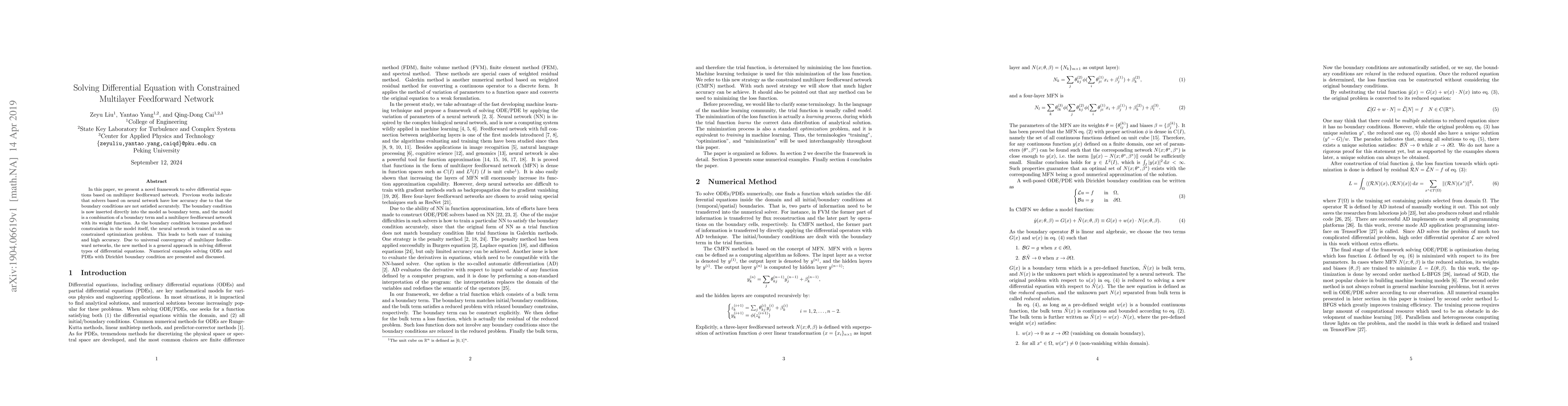 A new framework uses a multilayer feedforward network to solve differential equations with predefined boundary conditions, achieving high accuracy and ease of training.
