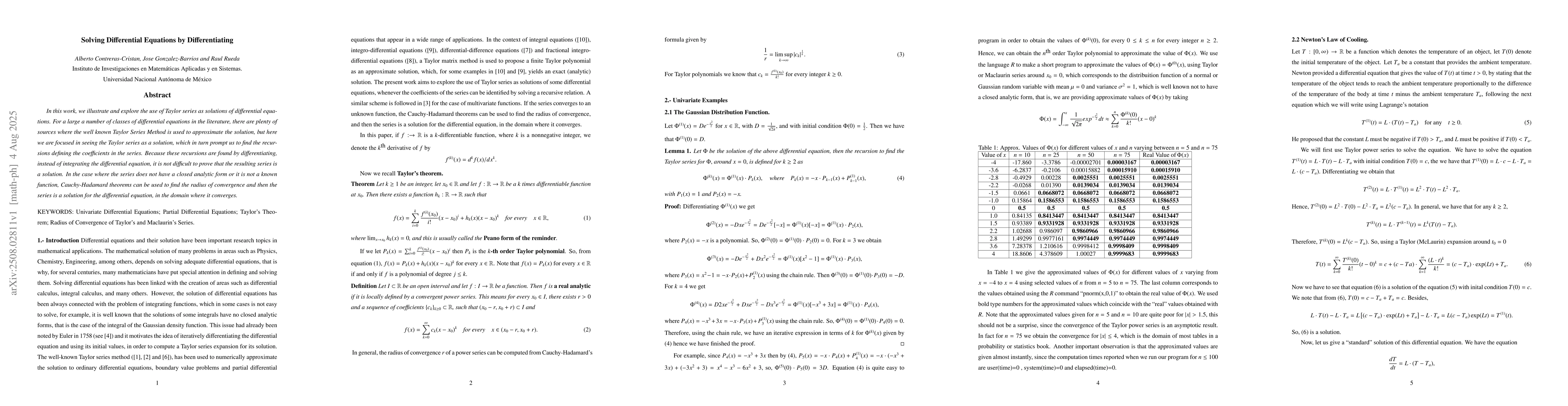 In this work, we illustrate and explore the use of Taylor series as solutions of differential equations. For a large a number of classes of differential equations in the literature, there are plenty of sources where the well known Taylor Series Method is used to approximate the solution, but here we are focused in seeing the Taylor series as a solution, which in turn prompt us to find the recursions defining the coefficients in the series. Because these recursions are found by differentiating, instead of integrating the differential equation, it is not difficult to prove that the resulting series is a solution. In the case where the series does not have a closed analytic form or it is not a known function, Cauchy-Hadamard theorems can be used to find the radius of convergence and then the series is a solution for the differential equation, in the domain where it converges.