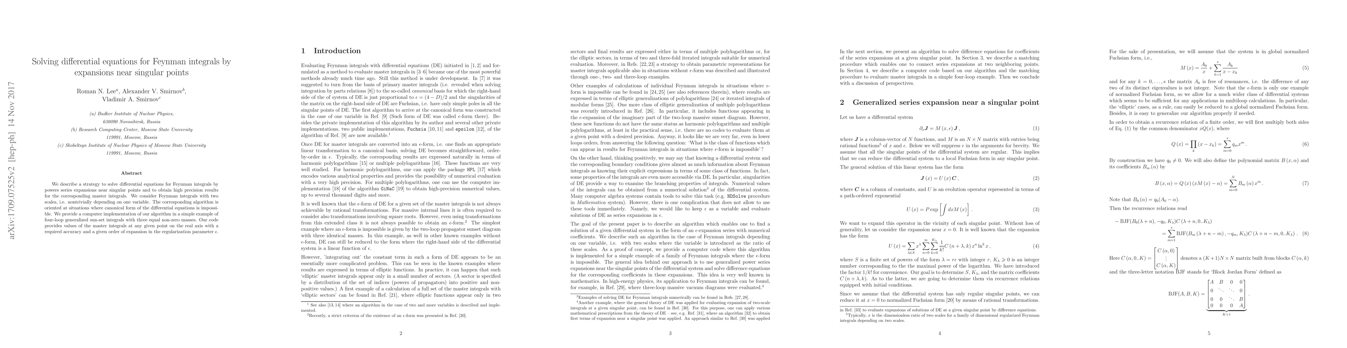 We describe a strategy to solve differential equations for Feynman integrals by powers series expansions near singular points and to obtain high precision results for the corresponding master integrals. We consider Feynman integrals with two scales, i.e. nontrivially depending on one variable. The corresponding algorithm is oriented at situations where canonical form of the differential equations is impossible. We provide a computer implementation of our algorithm in a simple example of four-loop generalized sun-set integrals with three equal non-zero masses. Our code provides values of the master integrals at any given point on the real axis with a required accuracy and a given order of expansion in the regularization parameter $\epsilon$.