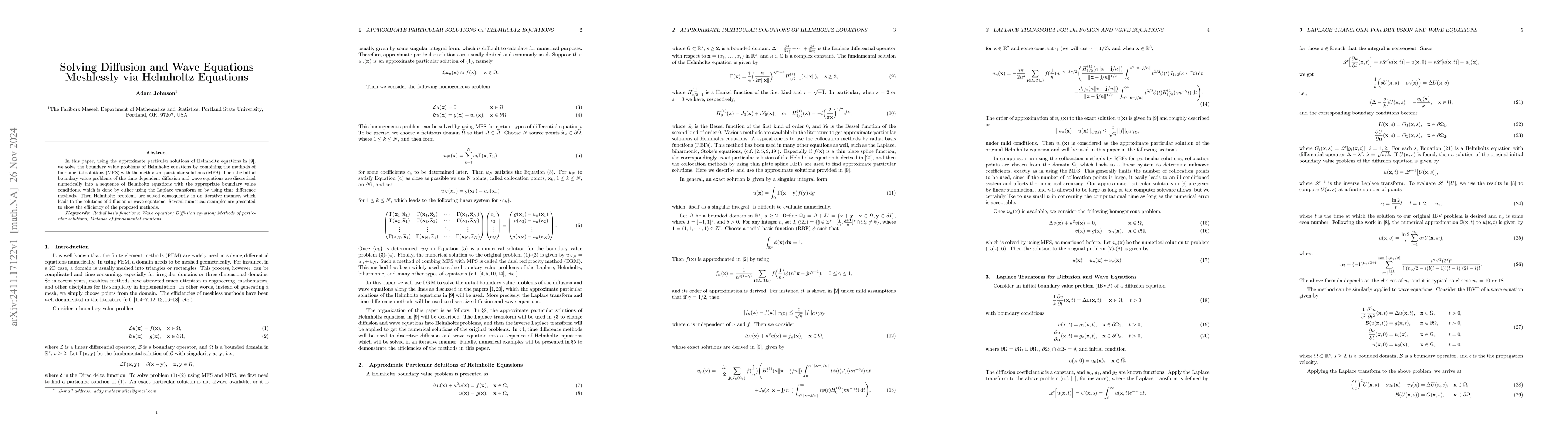 This research proposes a meshless method combining fundamental and particular solutions of Helmholtz equations to solve diffusion and wave equations. It uses the Laplace transform or time difference methods to discretize these problems into Helmholtz problems, which are iteratively solved to obtain the desired solutions, demonstrated through numerical examples.