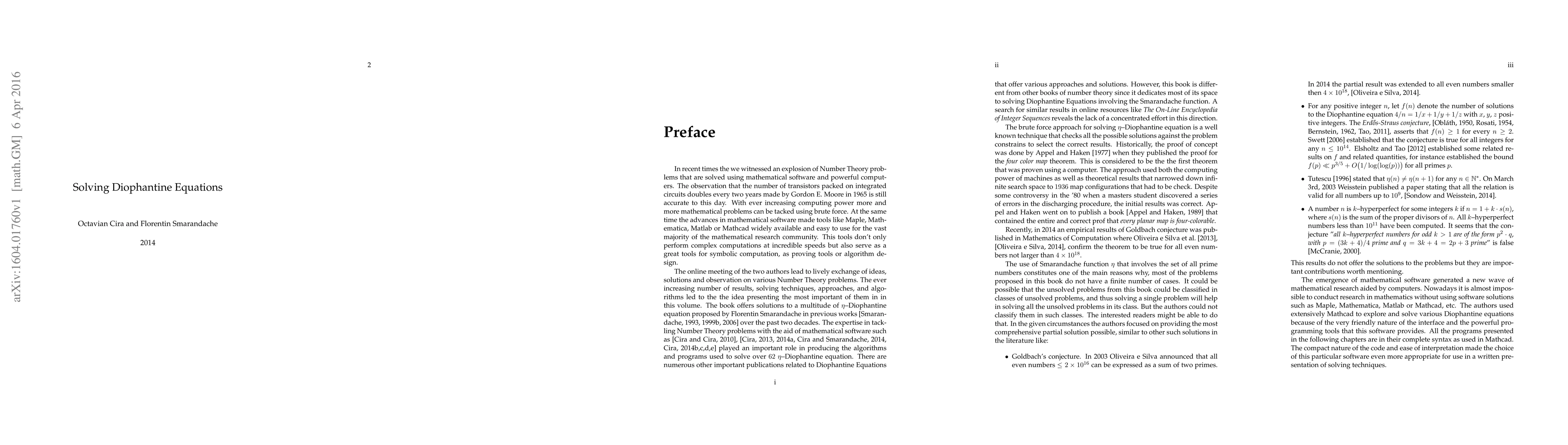 In this book a multitude of Diophantine equations and their partial or complete solutions are presented. How should we solve, for example, the equation {\eta}({\pi}(x)) = {\pi}({\eta}(x)), where {\eta} is the Smarandache function and {\pi} is Riemann function of counting the number of primes up to x, in the set of natural numbers? If an analytical method is not available, an idea would be to recall the empirical search for solutions. We establish a domain of searching for the solutions and then we check all possible situations, and of course we retain among them only those solutions that verify our equation. In other words, we say that the equation does not have solutions in the search domain, or the equation has n solutions in this domain. This mode of solving is called partial resolution. Partially solving a Diophantine equation may be a good start for a complete solving of the problem. The authors have identified 62 Diophantine equations that impose such approach and they partially solved them. For an efficient resolution it was necessarily that they have constructed many useful tools for partially solving the Diophantine equations into a reasonable time. The computer programs as tools were written in Mathcad, because this is a good mathematical software where many mathematical functions are implemented. Transposing the programs into another computer language is facile, and such algorithms can be turned to account on other calculation systems with various processors.