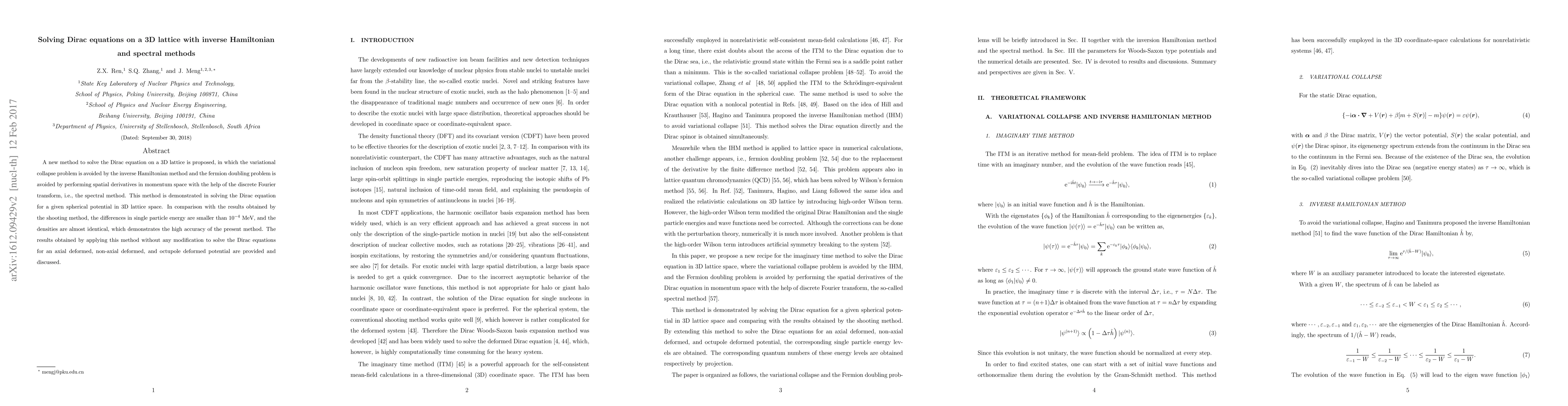 This paper proposes a new method for solving the Dirac equation on a 3D lattice using the inverse Hamiltonian and spectral methods to avoid variational collapse and fermion doubling problems. The method is shown to be highly accurate, with energy differences under $10^{-4}$ MeV compared to the shooting method, and is applied to various deformed potentials.