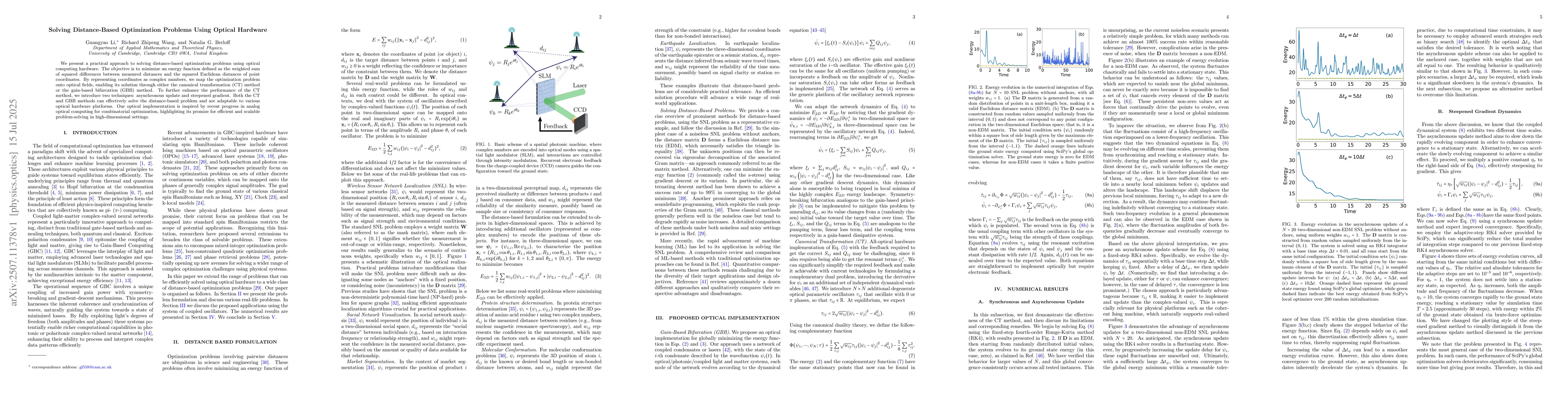 We present a practical approach to solving distance-based optimization problems using optical computing hardware. The objective is to minimize an energy function defined as the weighted sum of squared differences between measured distances and the squared Euclidean distances of point coordinates. By representing coordinates as complex numbers, we map the optimization problem onto optical fields, enabling its solution through either the canonical transformation (CT) method or the gain-based bifurcation (GBB) method. To further enhance the performance of the CT method, we introduce two techniques: asynchronous update and steepened gradient. Both the CT and GBB methods can effectively solve the distance-based problem and are adaptable to various optical hardware platforms. Our optical implementation is inspired by recent progress in analog optical computing for combinatorial optimization, highlighting its promise for efficient and scalable problem-solving in high-dimensional settings.