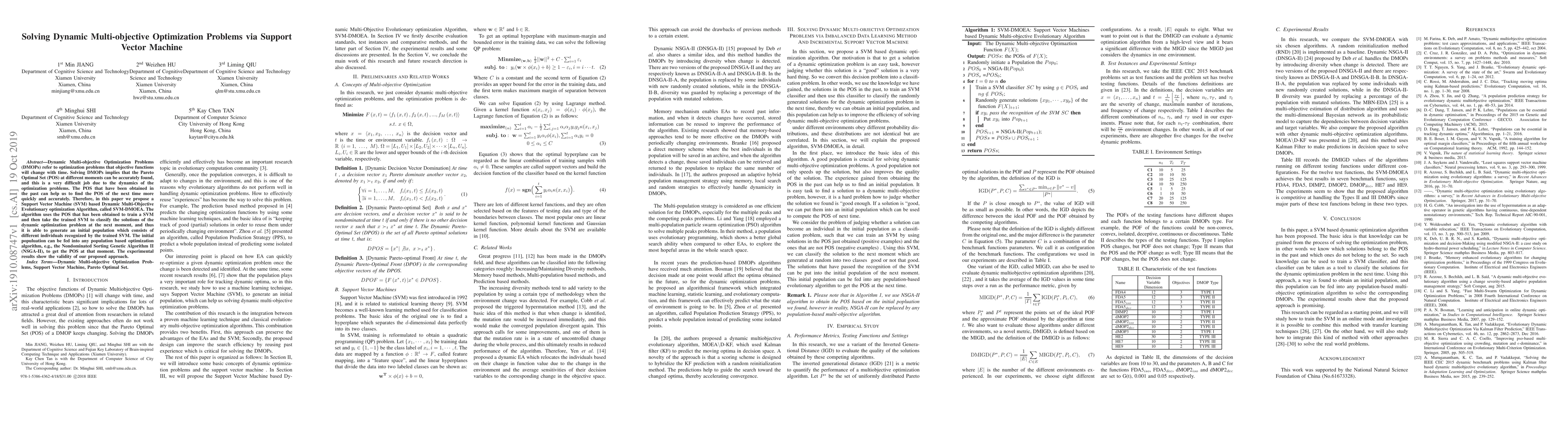 This paper presents an SVM-DMOEA algorithm to solve Dynamic Multi-Objective Optimization Problems (DMOPs) by leveraging past Pareto Optimal Sets (POS) to predict future POS. The SVM trained on past POS is used to generate an initial population for subsequent optimization, enhancing the efficiency of finding the current POS.