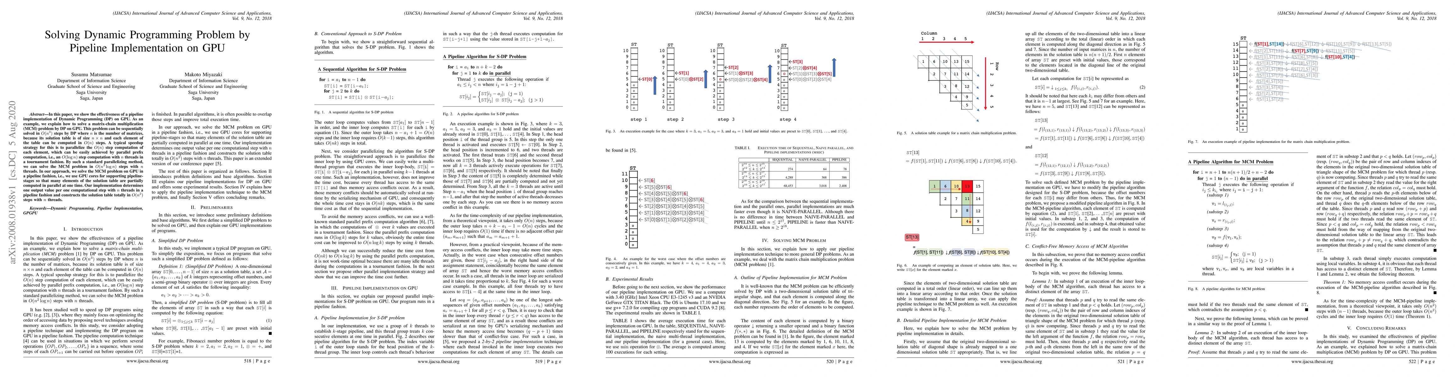 This paper demonstrates the efficiency of pipeline implementation of Dynamic Programming (DP) on GPU, using matrix-chain multiplication (MCM) as an example. The method constructs the solution table in O(n^2) steps with n threads, outperforming the standard parallelizing method's O(n^2 log n) steps.