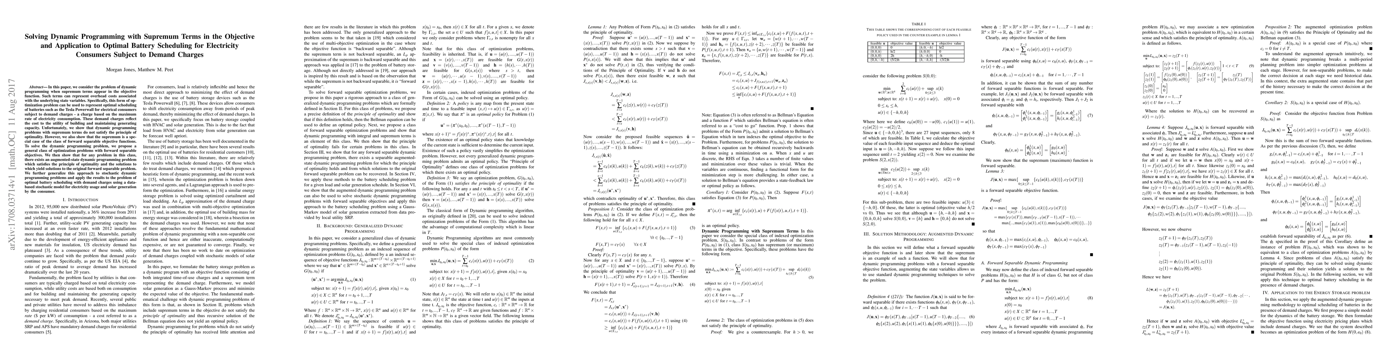 In this paper, we consider the problem of dynamic programming when supremum terms appear in the objective function. Such terms can represent overhead costs associated with the underlying state variables. Specifically, this form of optimization problem can be used to represent optimal scheduling of batteries such as the Tesla Powerwall for electrical consumers subject to demand charges - a charge based on the maximum rate of electricity consumption. These demand charges reflect the cost to the utility of building and maintaining generating capacity. Unfortunately, we show that dynamic programming problems with supremum terms do not satisfy the principle of optimality. However, we also show that the supremum is a special case of the class of forward separable objective functions. To solve the dynamic programming problem, we propose a general class of optimization problems with forward separable objectives. We then show that for any problem in this class, there exists an augmented-state dynamic programming problem which satisfies the principle of optimality and the solutions to which yield solutions to the original forward separable problem. We further generalize this approach to stochastic dynamic programming problems and apply the results to the problem of optimal battery scheduling with demand charges using a databased stochastic model for electricity usage and solar generation by the consumer.