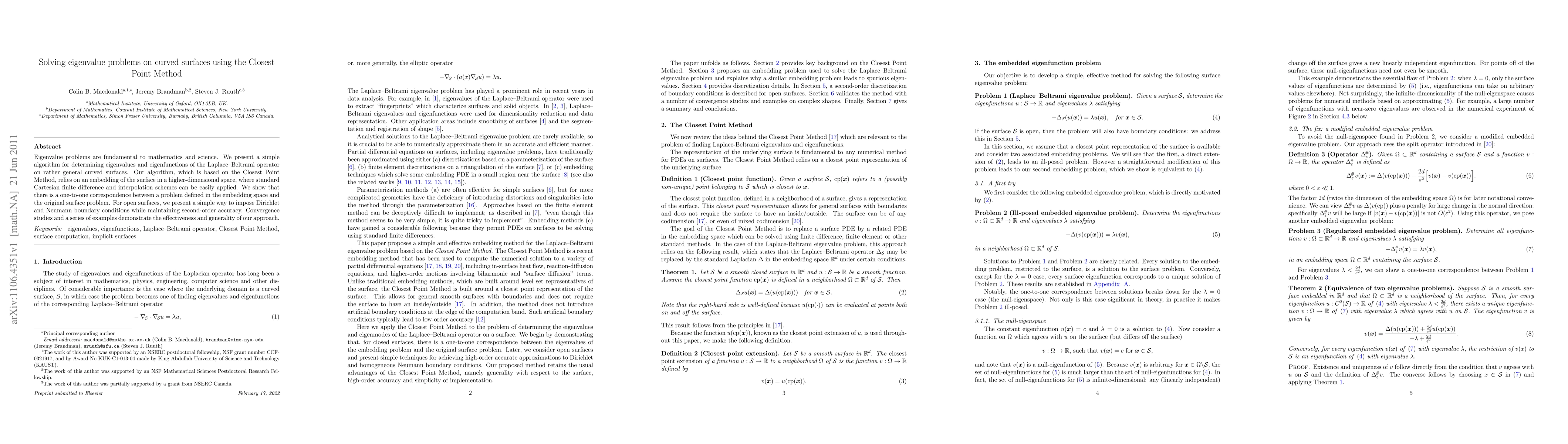 This paper introduces an algorithm based on the Closest Point Method to solve eigenvalue problems for the Laplace-Beltrami operator on curved surfaces by embedding them in higher-dimensional space. The method maintains second-order accuracy and allows for effective imposition of Dirichlet and Neumann boundary conditions.