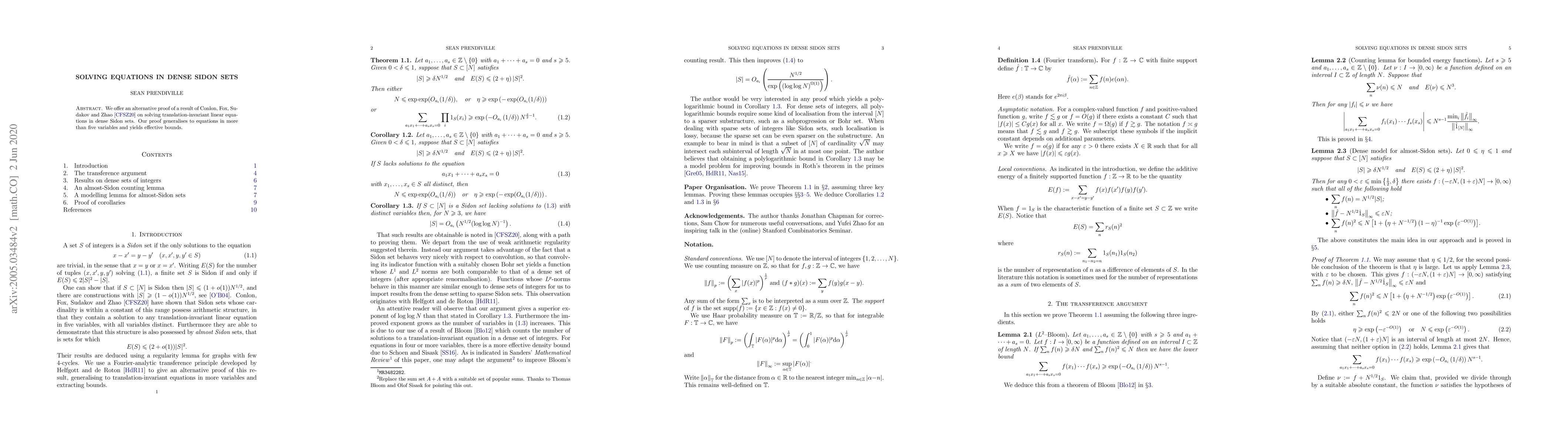 The paper provides an alternative proof for solving translation-invariant linear equations in dense Sidon sets, generalizing to more than five variables and yielding effective bounds.