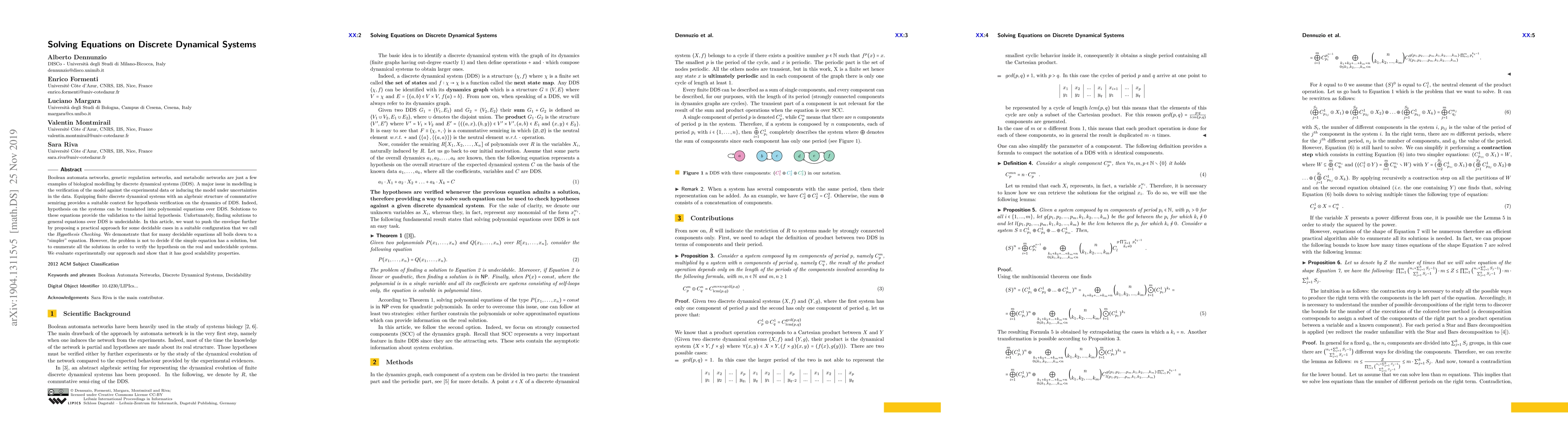Boolean automata networks, genetic regulation networks, and metabolic networks are just a few examples of biological modelling by discrete dynamical systems (DDS). A major issue in modelling is the verification of the model against the experimental data or inducing the model under uncertainties in the data. Equipping finite discrete dynamical systems with an algebraic structure of commutative semiring provides a suitable context for hypothesis verification on the dynamics of DDS. Indeed, hypothesis on the systems can be translated into polynomial equations over DDS. Solutions to these equations provide the validation to the initial hypothesis. Unfortunately, finding solutions to general equations over DDS is undecidable. In this article, we want to push the envelope further by proposing a practical approach for some decidable cases in a suitable configuration that we call the Hypothesis Checking. We demonstrate that for many decidable equations all boils down to a "simpler" equation. However, the problem is not to decide if the simple equation has a solution, but to enumerate all the solutions in order to verify the hypothesis on the real and undecidable systems. We evaluate experimentally our approach and show that it has good scalability properties.