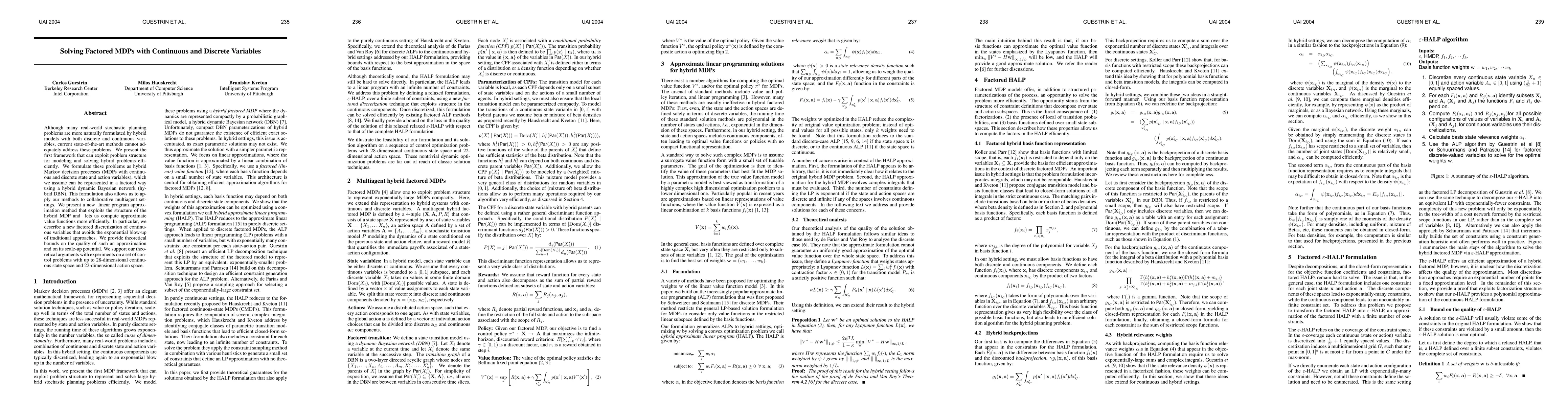 Although many real-world stochastic planning problems are more naturally formulated by hybrid models with both discrete and continuous variables, current state-of-the-art methods cannot adequately address these problems. We present the first framework that can exploit problem structure for modeling and solving hybrid problems efficiently. We formulate these problems as hybrid Markov decision processes (MDPs with continuous and discrete state and action variables), which we assume can be represented in a factored way using a hybrid dynamic Bayesian network (hybrid DBN). This formulation also allows us to apply our methods to collaborative multiagent settings. We present a new linear program approximation method that exploits the structure of the hybrid MDP and lets us compute approximate value functions more efficiently. In particular, we describe a new factored discretization of continuous variables that avoids the exponential blow-up of traditional approaches. We provide theoretical bounds on the quality of such an approximation and on its scale-up potential. We support our theoretical arguments with experiments on a set of control problems with up to 28-dimensional continuous state space and 22-dimensional action space.