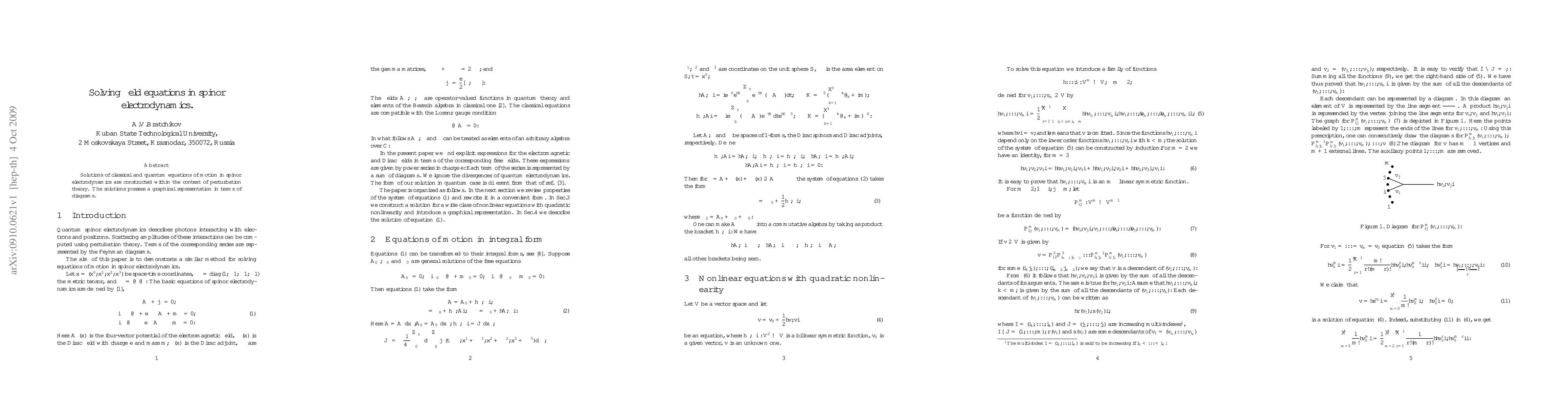 Summary: This paper constructs solutions for classical and quantum equations in spinor electrodynamics using perturbation theory, with graphical representations provided in diagram form. The focus is on the interplay between spinor fields and electromagnetic interactions.