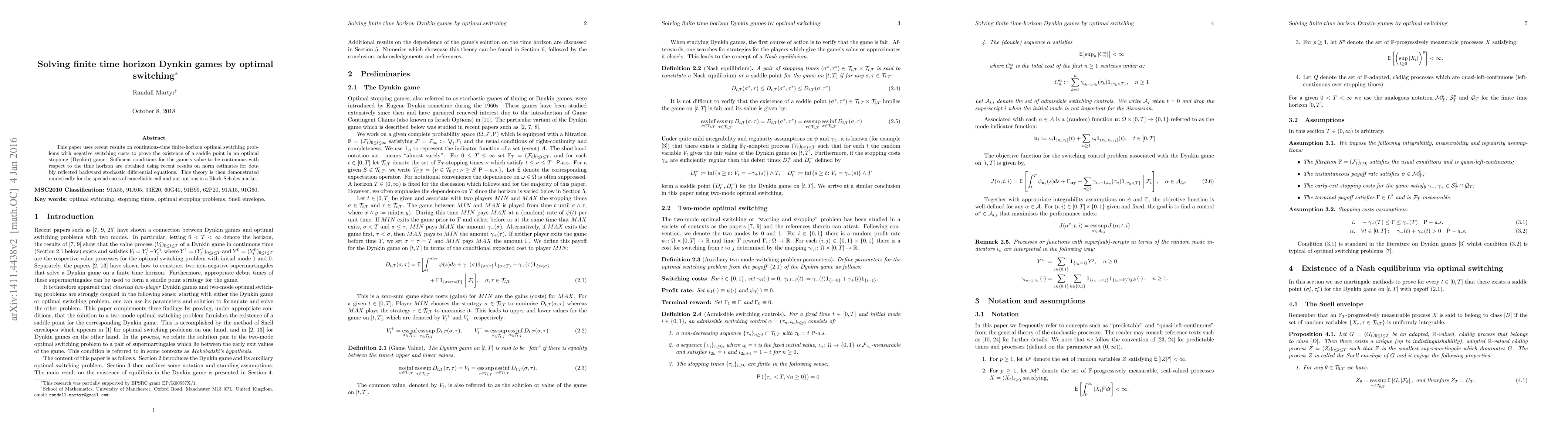 This paper establishes the existence of a saddle point in finite time horizon Dynkin games using optimal switching theory and proves continuity conditions for the game's value, demonstrated numerically for cancellable options in a Black-Scholes market.