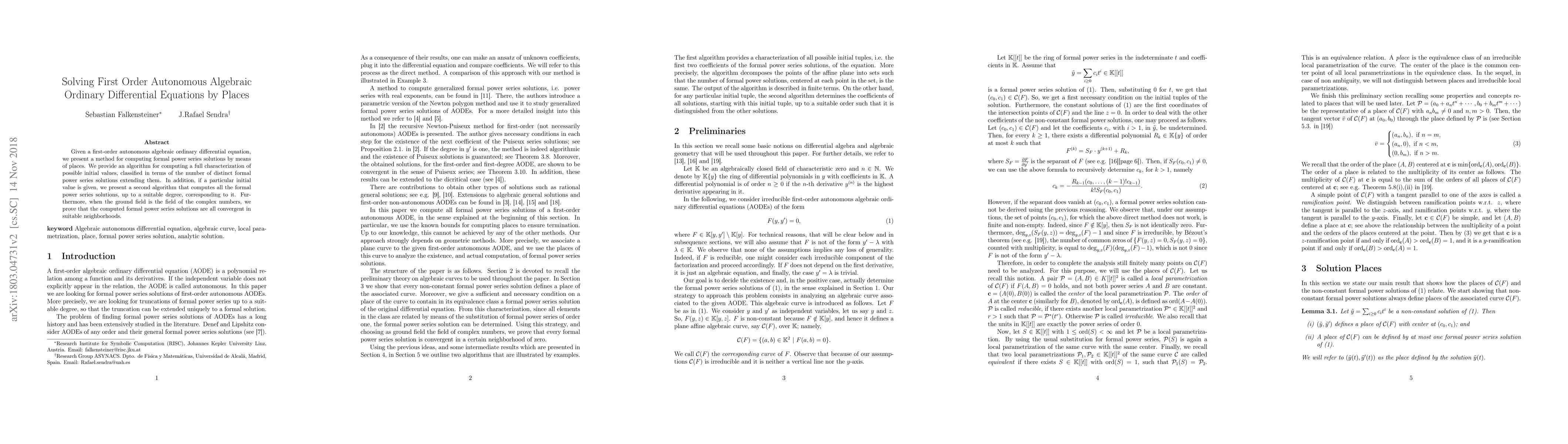 Researchers developed an algorithm to solve first-order autonomous algebraic ordinary differential equations, providing a method for computing formal power series solutions and classifying possible initial values.