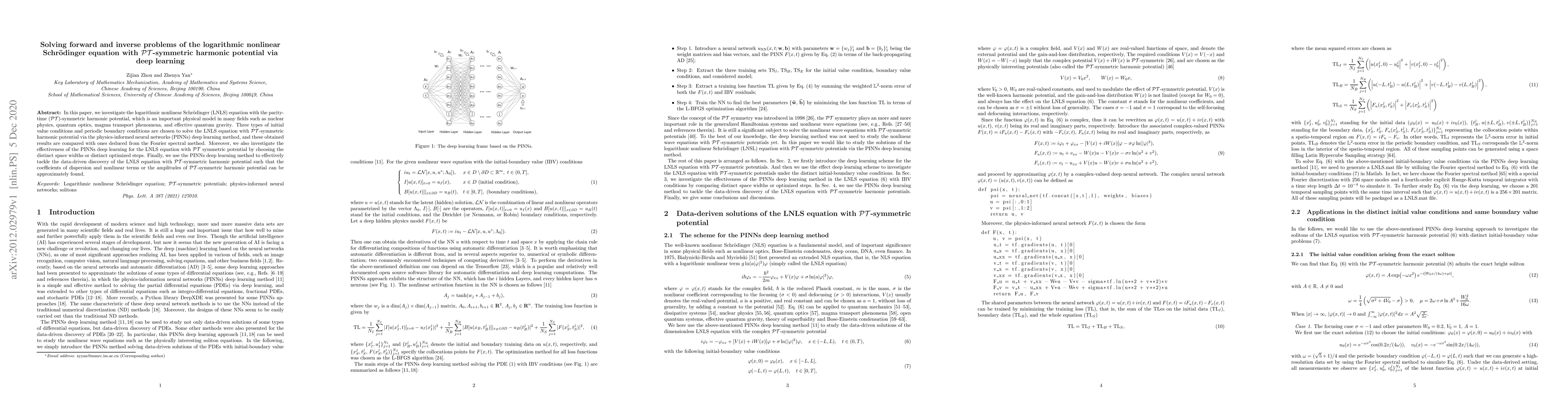 This paper employs physics-informed neural networks (PINNs) to solve the logarithmic nonlinear Schrödinger equation with PT-symmetric harmonic potential, comparing results with Fourier spectral methods and exploring the method's effectiveness under various conditions. The PINNs approach also aids in discovering the equation's parameters.
