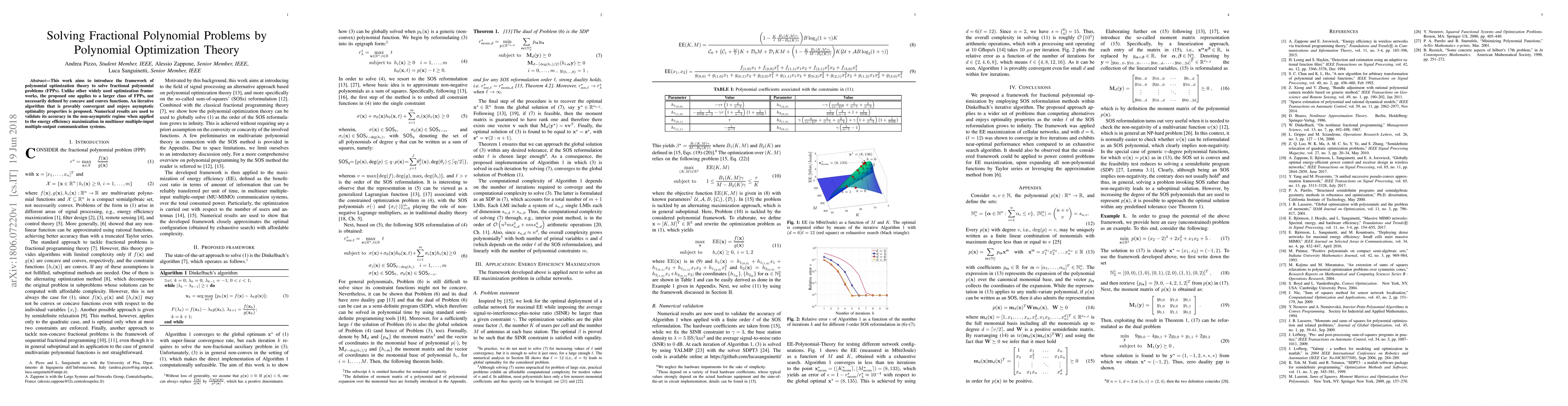 This paper introduces a new framework using polynomial optimization theory to solve fractional polynomial problems, offering a larger class of solvable FPPs and numerical validation for energy efficiency maximization in communication systems.